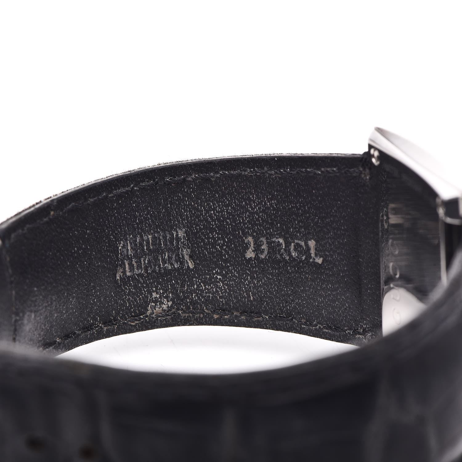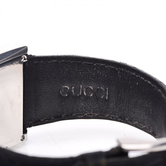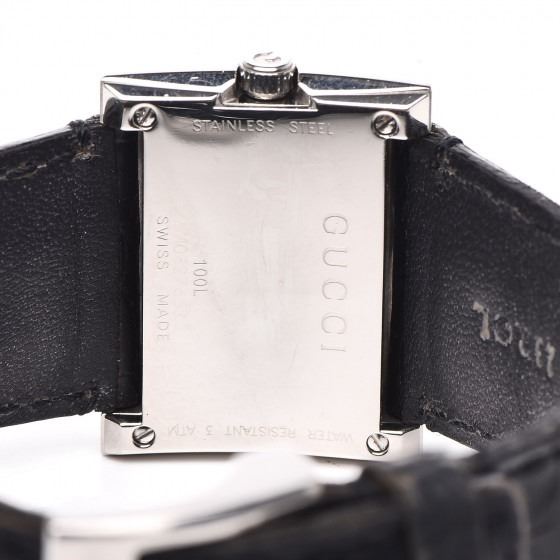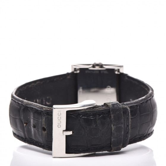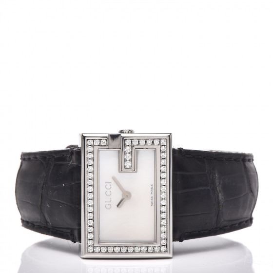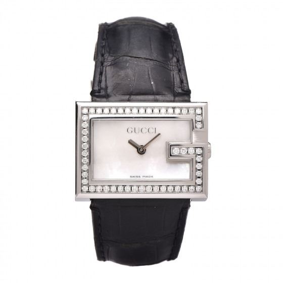 This watch is composed of stainless steel and a black alligator strap. Features also include a G shaped case, a mother of pearl dial, a diamond accented bezel, and Swiss quartz movement.