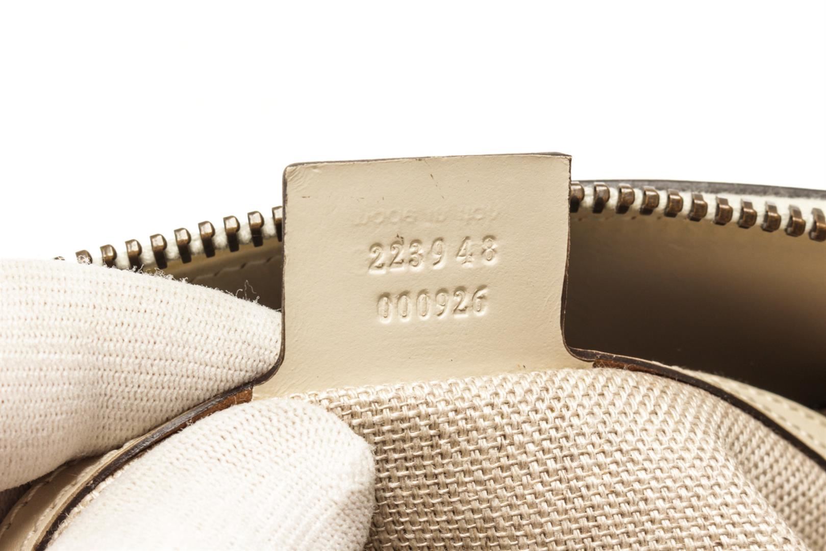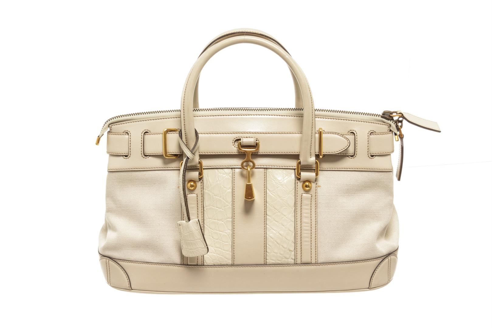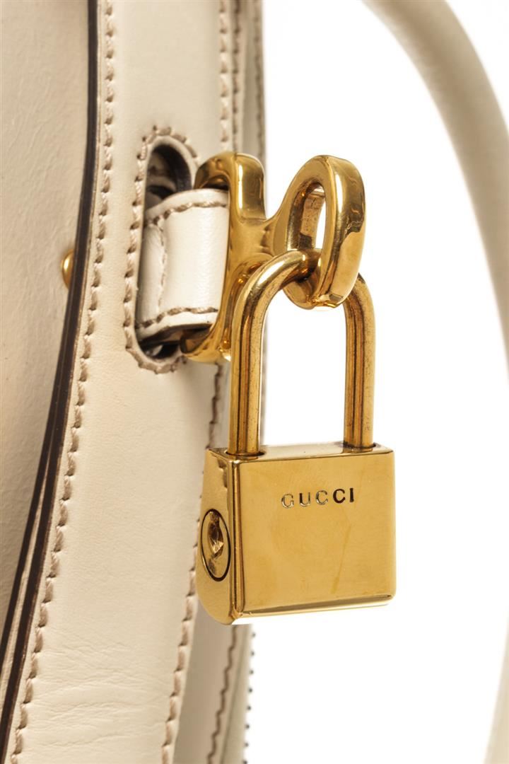 One Gucci White Leather Lock Shoulder Bag. Item is sold AS-IS. All available information is listed in the description and shown in the photo. Gucci White Leather Lock Shoulder Bag with top handle, canvas lining, interior zipper pocket, gold-tone hardware, zipper closure.