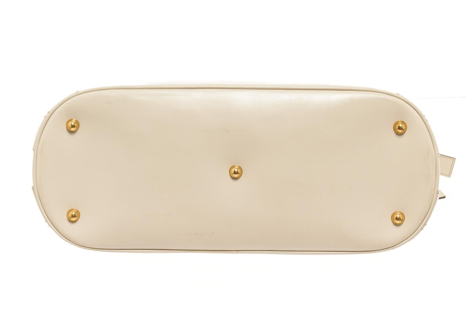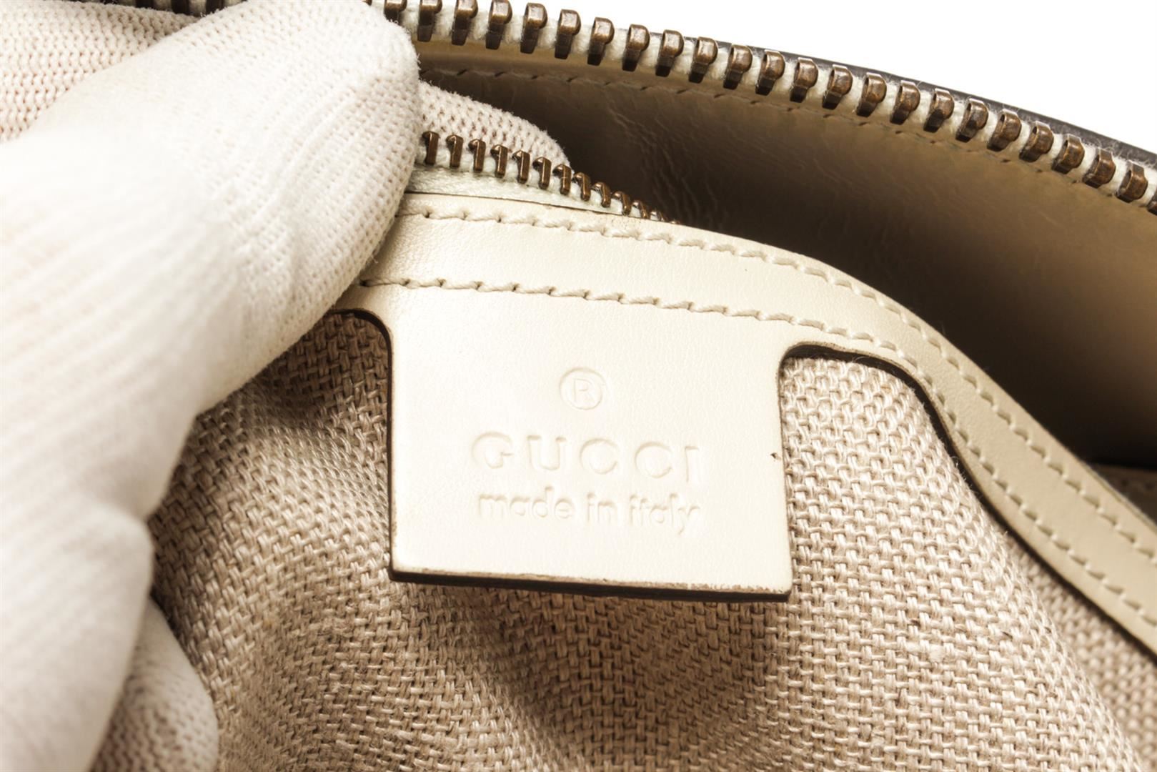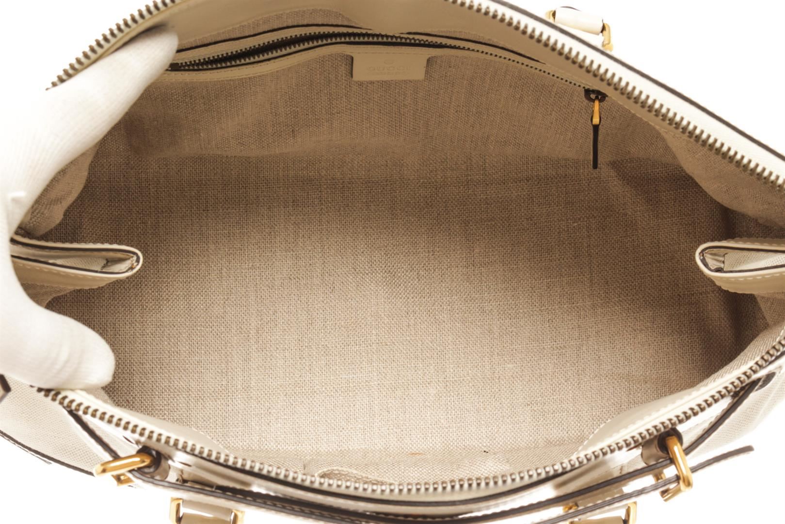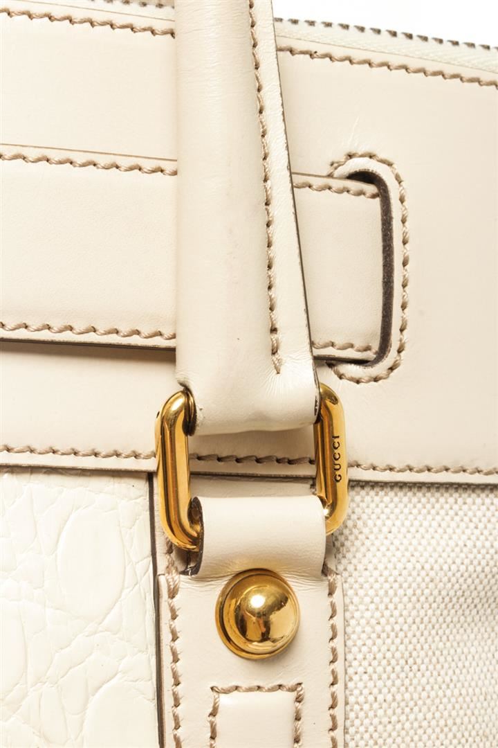 One Gucci White Leather Lock Shoulder Bag. Item is sold AS-IS. All available information is listed in the description and shown in the photo. Gucci White Leather Lock Shoulder Bag with top handle, canvas lining, interior zipper pocket, gold-tone hardware, zipper closure.