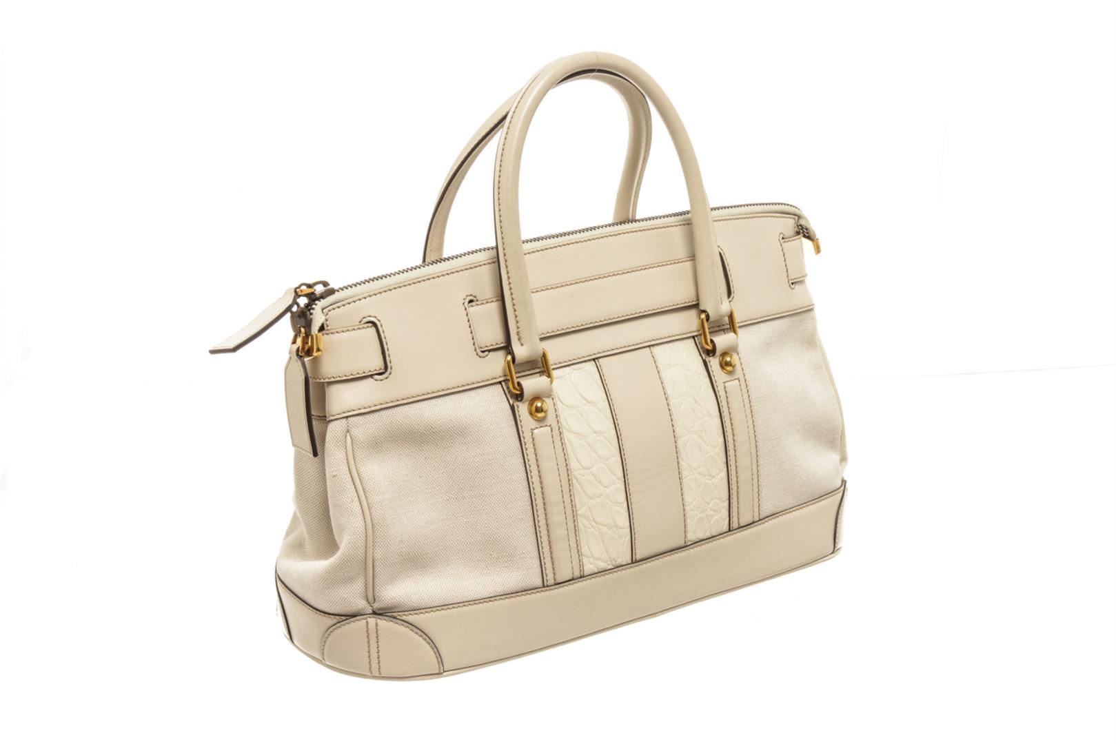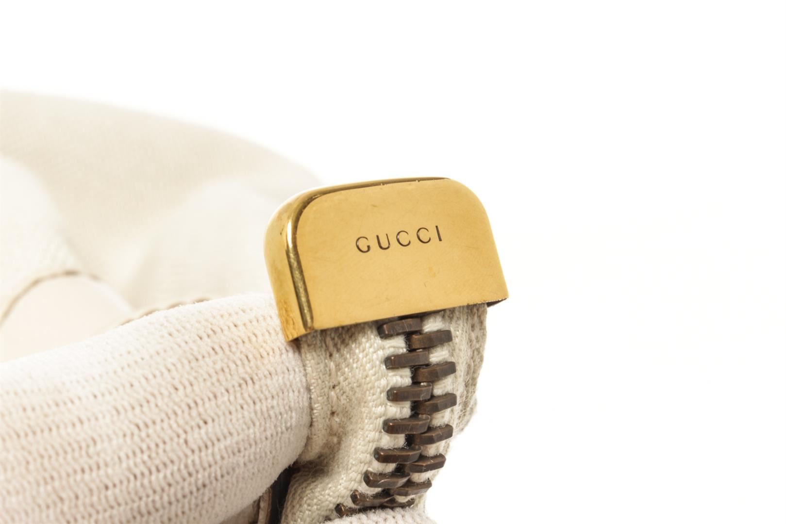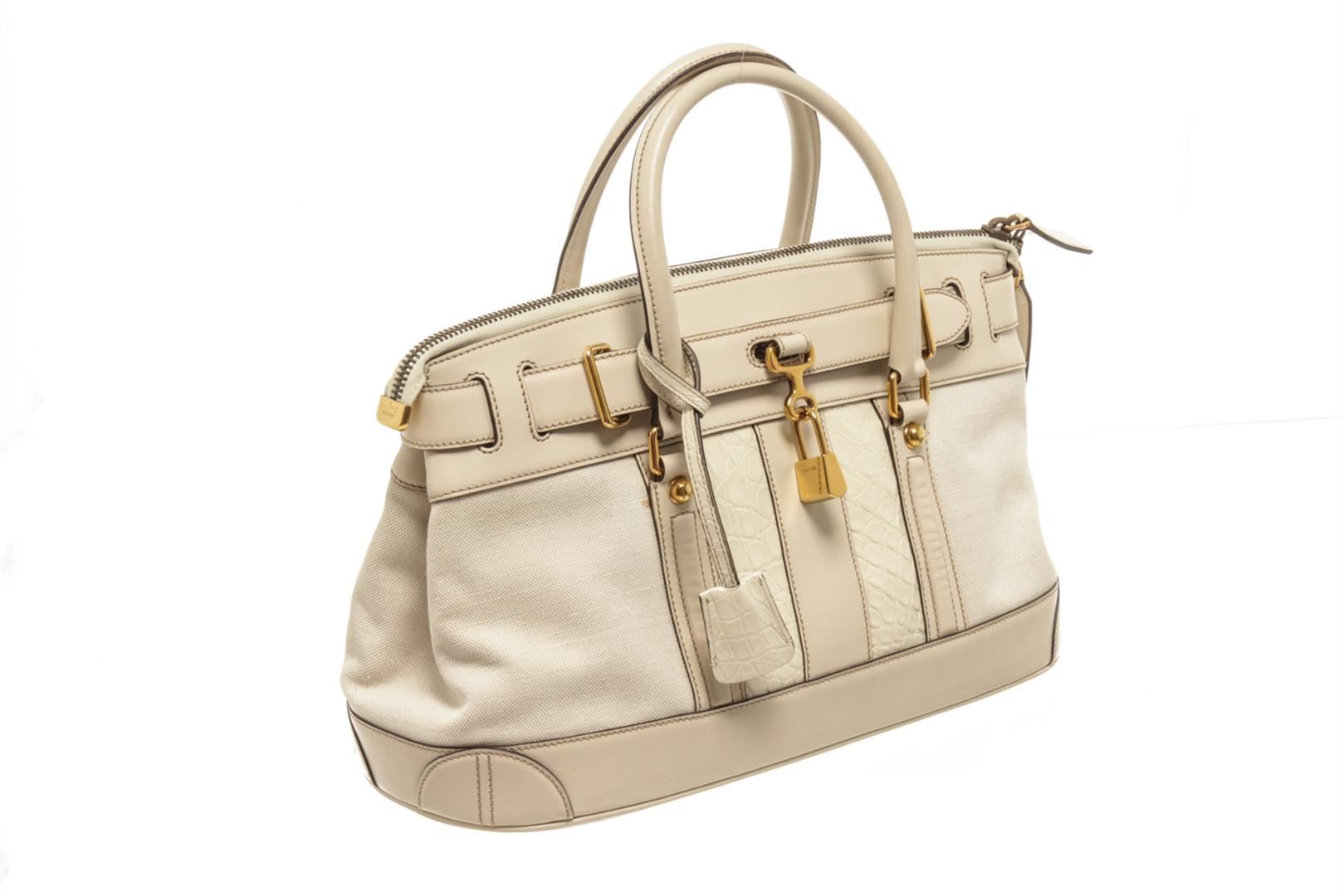 One Gucci White Leather Lock Shoulder Bag. Item is sold AS-IS. All available information is listed in the description and shown in the photo. Gucci White Leather Lock Shoulder Bag with top handle, canvas lining, interior zipper pocket, gold-tone hardware, zipper closure.