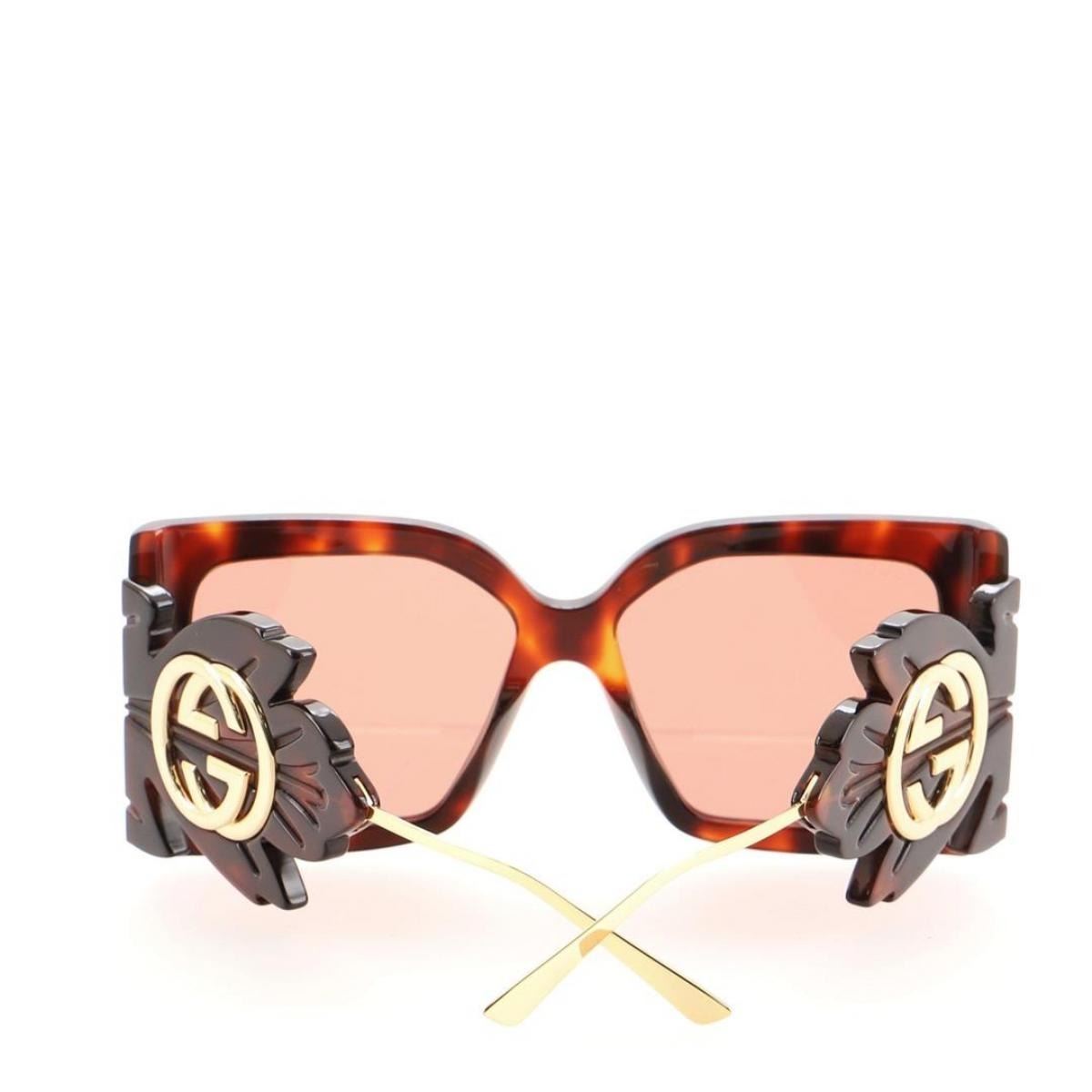 Gucci Wing Square Sunglasses Tortoise Acetate and Metal Brown Tortoise Condition Details: Uneven temples, moderate wear and scratches on exterior, lenses and hardware. Height 2", Width 6", Depth ", Strap Drop None