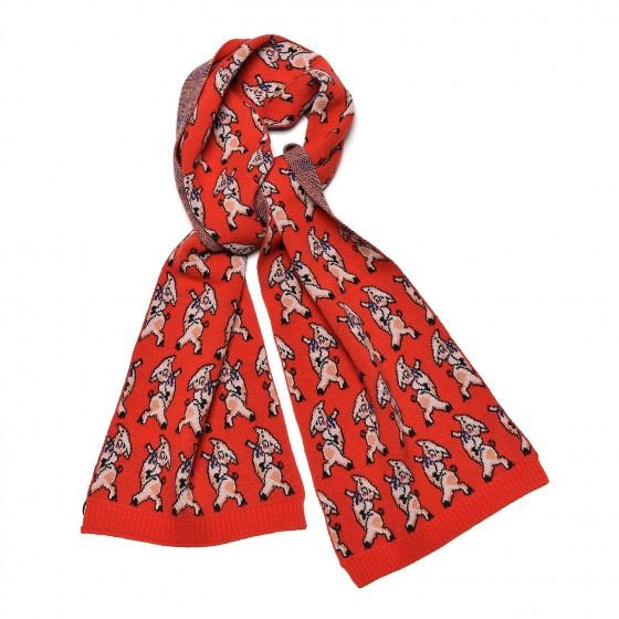 Flame Pink scarf is 100% wool and features a beautiful print of dancing pigs.