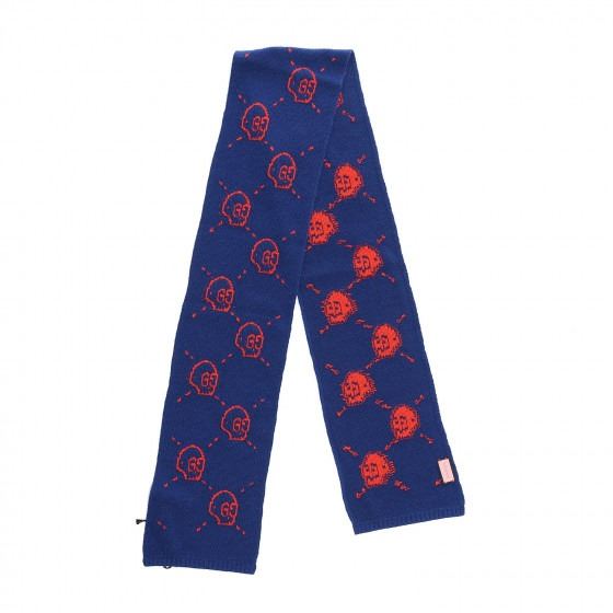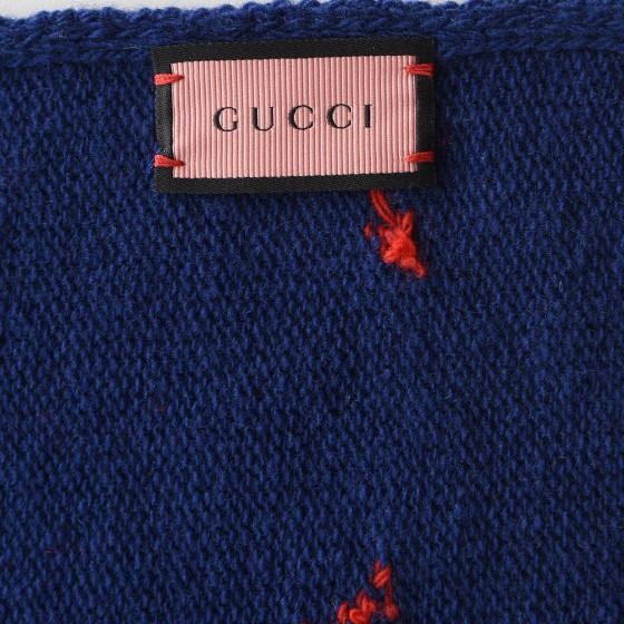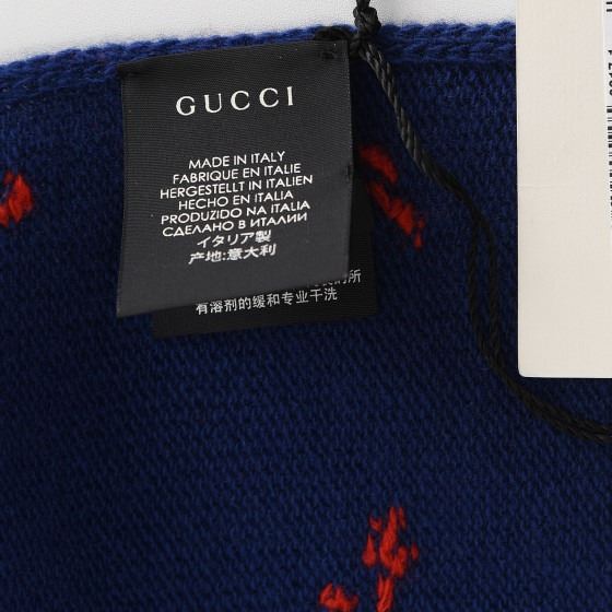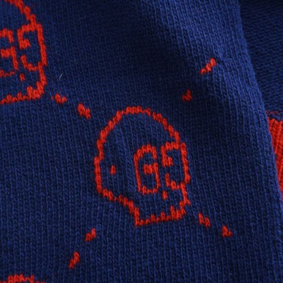This scarf is crafted of 100% wool and features red Skull GG logos on a blue background.