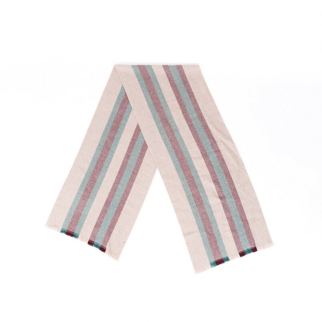 Men's Gucci wool Web stripe scarf features frayed fringe edges.