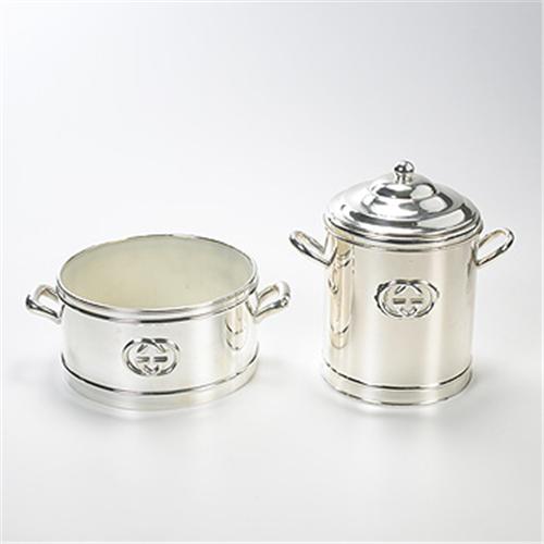 Gucci ice bucket and bowl Italy c. 1970 silver-plated steel, lacquer 8.5 w x 6 d x 8.75 h inches Impressed signature to underside of each element: [Gucci Made in Italy]. Bowl measures: 10 w x 8 d x 4 h inches.