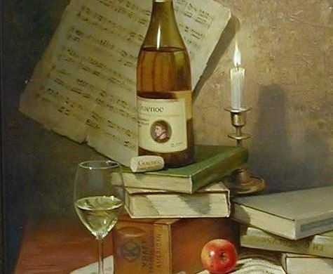 Guenoc Wine by Dimitri Annenkov framed orginial oil on canvas featuring a stack of books next to a glass of wine and a bottle of Guenoc on top of the books. Sized at 49 1/2" x 37 1/2".