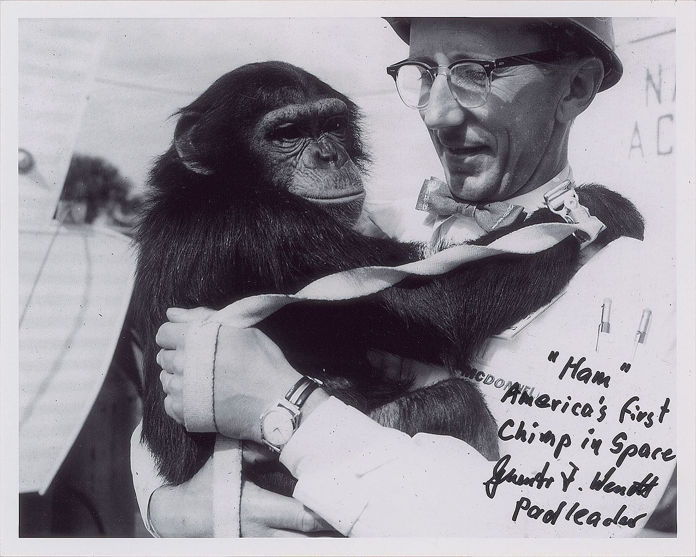 Satin-finish 10 x 8 photo of launch pad leader Guenter Wendt holding Ham the chimpanzee, signed in black felt tip, "'Ham,' America's first chimp in space, Guenter F. Wendt, Pad leader." In very fine condition. Named after the Holloman Aerospace Medical Center, Ham was an integral member of the Mercury-Redstone 2 mission, a 16-minute suborbital test flight that launched from Cape Canaveral on January 31, 1961.