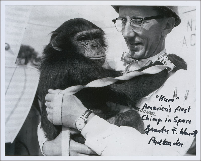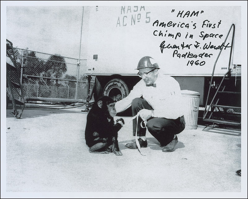 Two satin-finish 10 x 8 photos of Wendt and Ham the Chimp, each signed in black felt tip, “’Ham’ America’s first chimp in space. Guenter F. Wendt, Pad Leader.” In very fine condition.