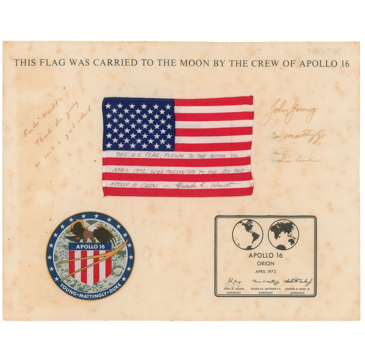 Magnificent flown American flag carried on the Apollo 16 mission, 5.75 x 3.75, signed and flight-certified in black ballpoint, “This U. S. flag, flown to the moon in April 1972, was presented to me by the Apollo 16 crew—Guenter F. Wendt.” Includes the original vellum presentation sheet, headed “This flag was carried to the moon by the crew of Apollo 16,” and signed in the right portion in black felt tip by John Young, Charlie Duke, and Ken Mattingly, who adds in the upper left, “Guenter Wendt—Thanks for giving us such a good start.” A Beta patch of the Apollo 16 mission insignia is affixed to the front of the sheet, which also bears a signed Guenter Wendt personal collection stamp on the reverse. The flag is in fine condition; presentation sheet is in very good condition, with overall scattered spots of toning, the signatures a few shades light and affected by dampstaining on the left side, and a pronounced central vertical fold. A beautiful token of appreciation from the Apollo 16 crew to the Kennedy Space Center’s venerated launch pad leader.