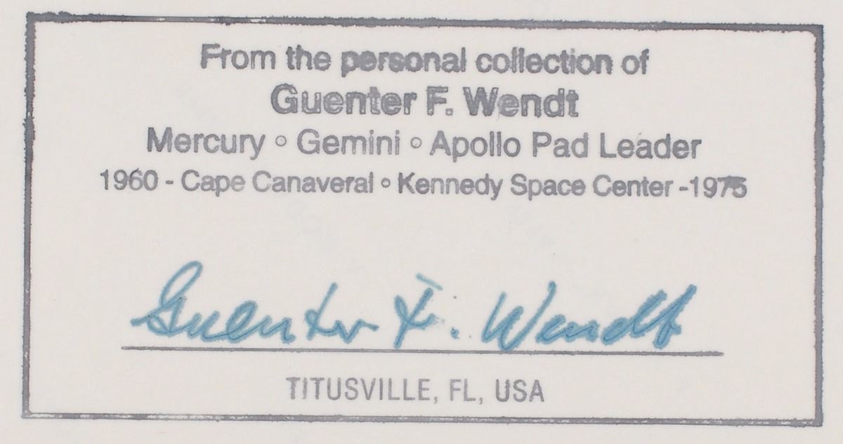 Impressive collection of 30 photographs personally-owned by Guenter Wendt from throughout his career in NASA Mission Control, ranging from Project Mercury through Skylab, including a glossy 8 x 10 of him wearing a hardhat, signed and inscribed in black felt tip, “To Leon Ford; I hope you enjoy the space photos from my collection, Guenter F .Wendt, Pad Leader (1960–75).” All but the inscribed photo are signed on the reverse by Wendt and stamped as being from his personal collection, with many also bearing the typical purple NASA caption text. Some of the subjects depicted include: Buzz Aldrin on the lunar surface standing beside the deployed Solar Wind Composition Experiment during Apollo 11; Alan Shepard during a simulation exercise before MR-3; the Apollo 15 rover on the lunar surface; and the Apollo 16 rocket prepared to launch. In overall fine condition. A nice representation of NASA’s glory days from the collection of an important insider. The Leon Ford Collection.