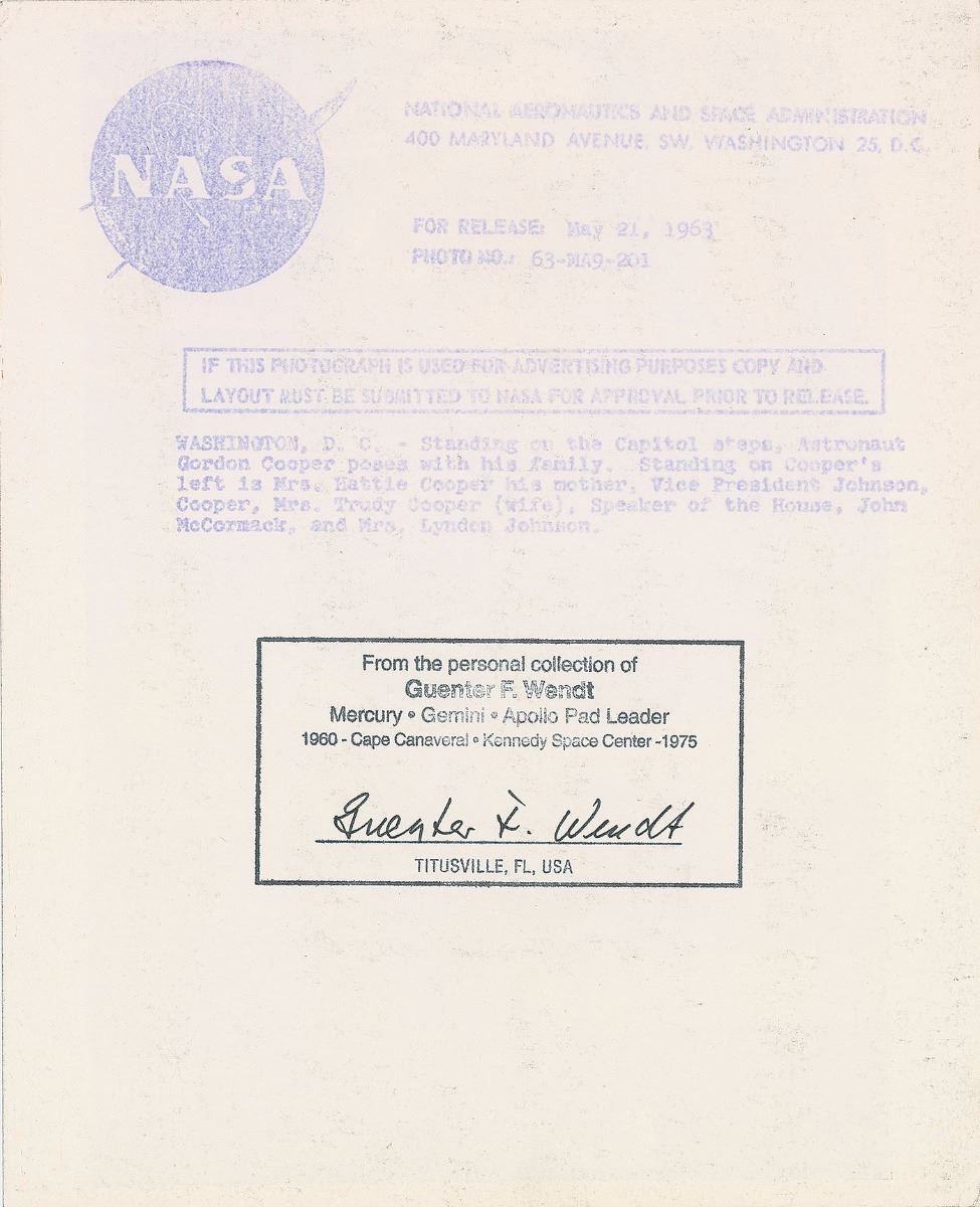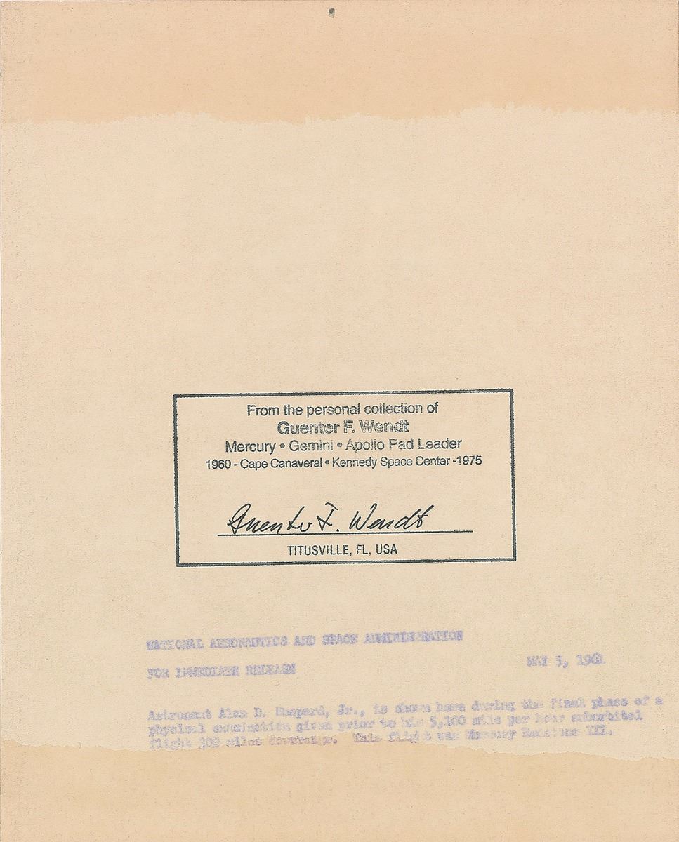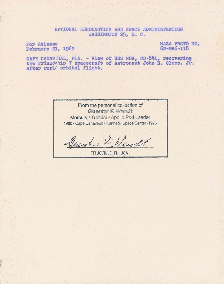 Set of six official glossy 8 x 10 and 10 x 8 NASA photos from various stages of the Mercury program, all of which originate from the collection of longtime NASA pad leader Guenter Wendt. Images include: a shirtless Alan Shepard during a physical exam; an up-close and detailed look at a heat shield; a view of the USS NOA recovering the Friendship 7 spacecraft; an image of Mercury Control Center lighting up cigars following the safe return of Gordon Cooper’s Faith 7; a modified astronaut couch; and a group shot of Cooper and his family posing alongside Vice President Lyndon B. Johnson and Speaker of the House John McCormack. Each photo is signed on the reverse by Wendt, “Guenter F. Wendt,” and stamped as being from his personal collection. In overall fine condition. The Guenter Wendt Collection, ex. Ken Havekotte.