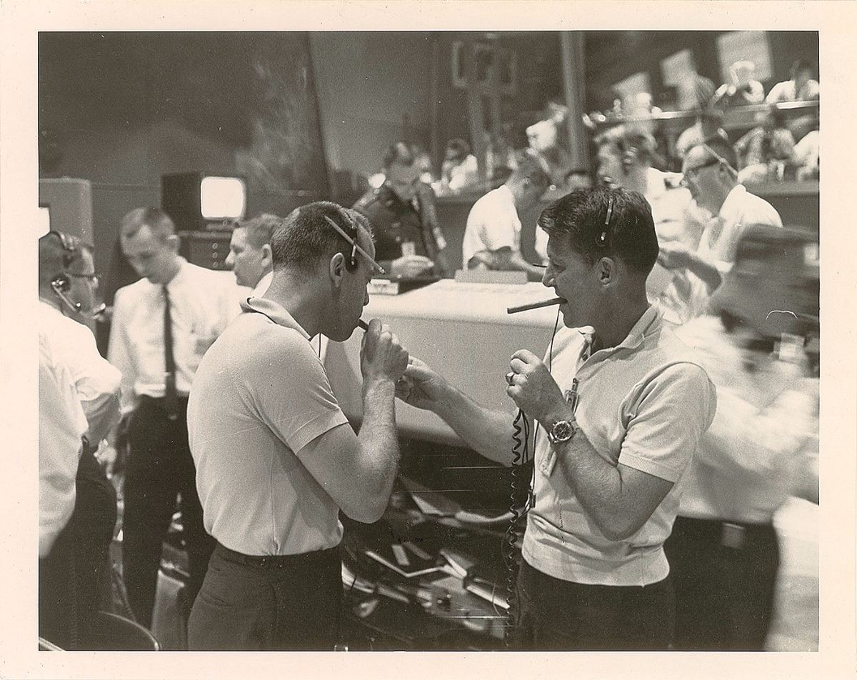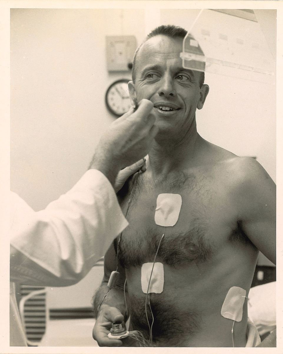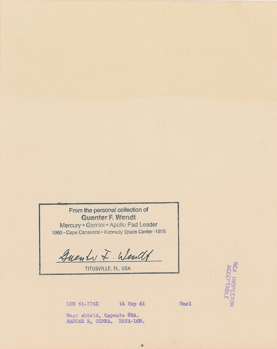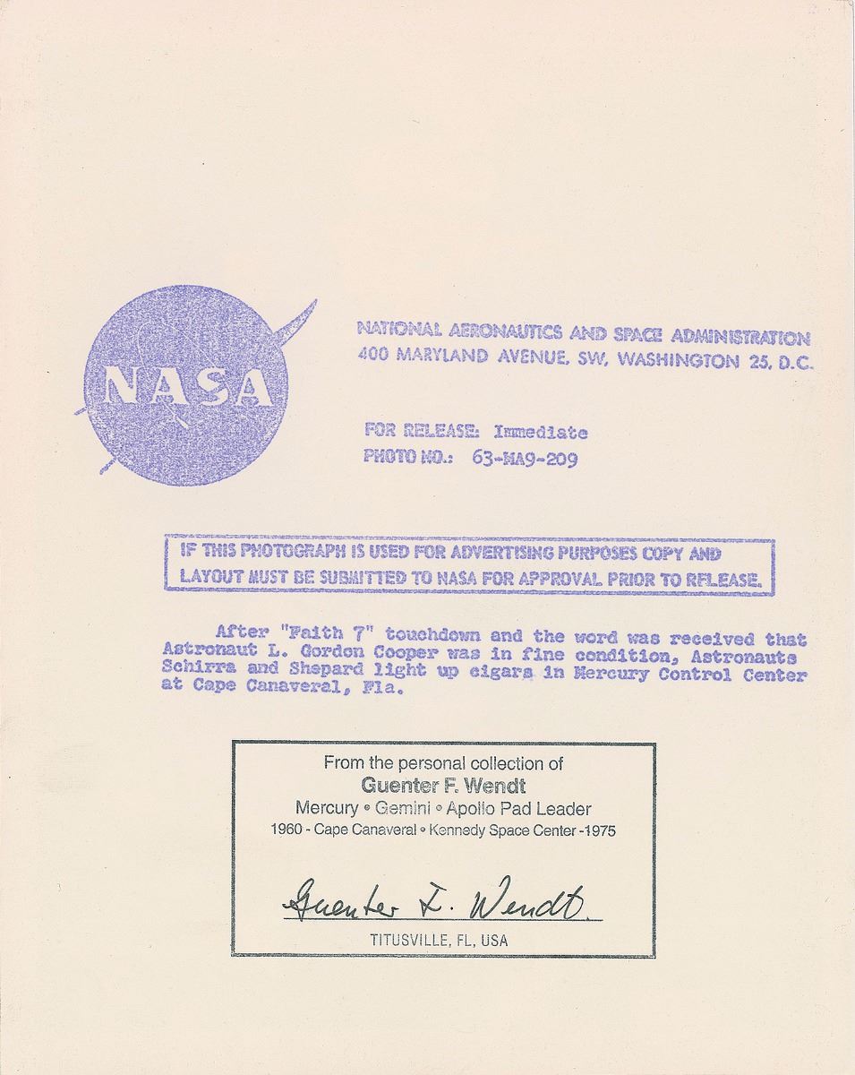 Set of six official glossy 8 x 10 and 10 x 8 NASA photos from various stages of the Mercury program, all of which originate from the collection of longtime NASA pad leader Guenter Wendt. Images include: a shirtless Alan Shepard during a physical exam; an up-close and detailed look at a heat shield; a view of the USS NOA recovering the Friendship 7 spacecraft; an image of Mercury Control Center lighting up cigars following the safe return of Gordon Cooper’s Faith 7; a modified astronaut couch; and a group shot of Cooper and his family posing alongside Vice President Lyndon B. Johnson and Speaker of the House John McCormack. Each photo is signed on the reverse by Wendt, “Guenter F. Wendt,” and stamped as being from his personal collection. In overall fine condition. The Guenter Wendt Collection, ex. Ken Havekotte.