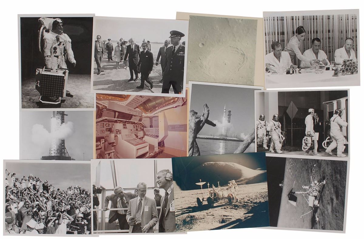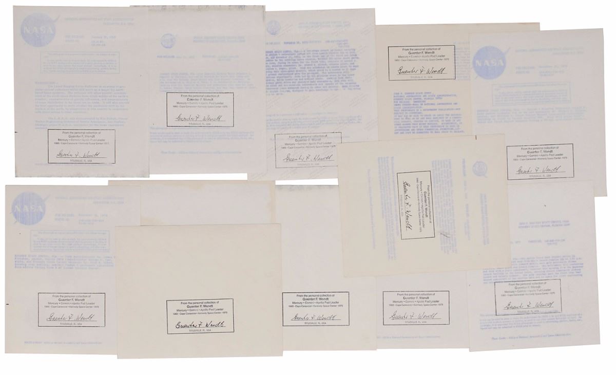 Set of twelve official glossy 8 x 10 and 10 x 8 NASA photos from various NASA programs such as Apollo, Soyuz, and Skylab, all of which originate from the collection of longtime NASA pad leader Guenter Wendt. Images include: an astronaut holding a machine called the Laser Ranging Retro–Reflector; Imperial Majesty Haile Selassie arriving at Patrick Air Force Base; an aerial view of the cratered lunar surface; the launch of the Apollo–Soyuz Test Project Saturn 1B rocket; a flight deck with control panel and various instruments; the Surveyor III and lunar module Intrepid of Apollo 12 on the lunar surface; a crowd of people watching the launch of the Apollo 15 Saturn V rocket; an astronaut standing next to the lunar rover on the moon’s surface; a group shot of NASA heads James C. Fletcher, George M. Low, and Kurt H. Debus during Skylab 4 pre-launch; the launch of Skylab 4 on November 16, 1973; a NASA food technician serving Skylab 4 astronauts Bill Pogue, Ed Gibson, and Gerry Carr; and the Skylab 4 prime crew en route to Launch Complex 39B. Each photo is signed on the reverse by Wendt, “Guenter F. Wendt,” and stamped as being from his personal collection. In overall fine condition. The Guenter Wendt Collection, ex. Ken Havekotte.