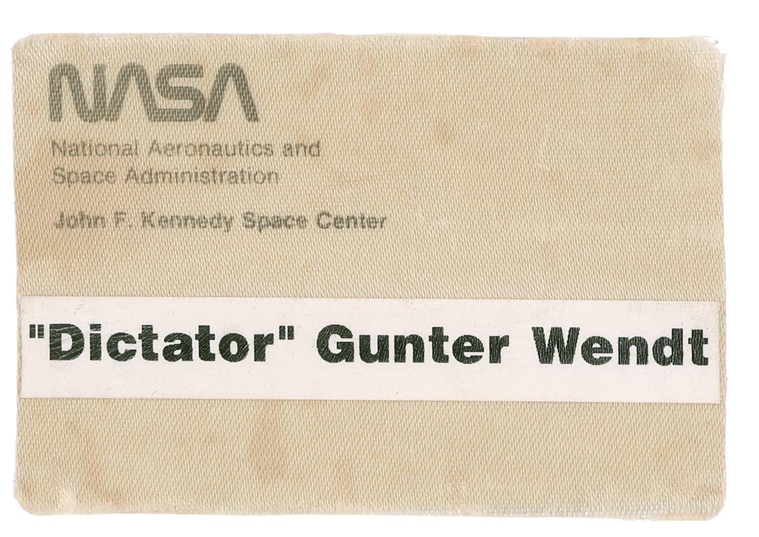 Clipped original fabric name patch from NASA’s Kennedy Space Center, 3.5 x 2.5, with the name of beloved pad leader, “Dictator’ Guenter Wendt,” affixed in the center. The name tag was used in celebration of Wendt’s 1975 retirement from the space agency. Normal wear.