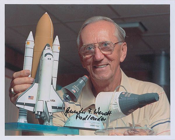 Two color satin-finish photos, one 8 x 10 of Wendt with the Liberty Bell 7 capsule, signed in black felt tip, “Guenter F. Wendt, Project Mercury Padleader,” and one 10 x 8 of him posing with models, signed in black felt tip, “Guenter F. Wendt, Padleader.” In very fine condition.