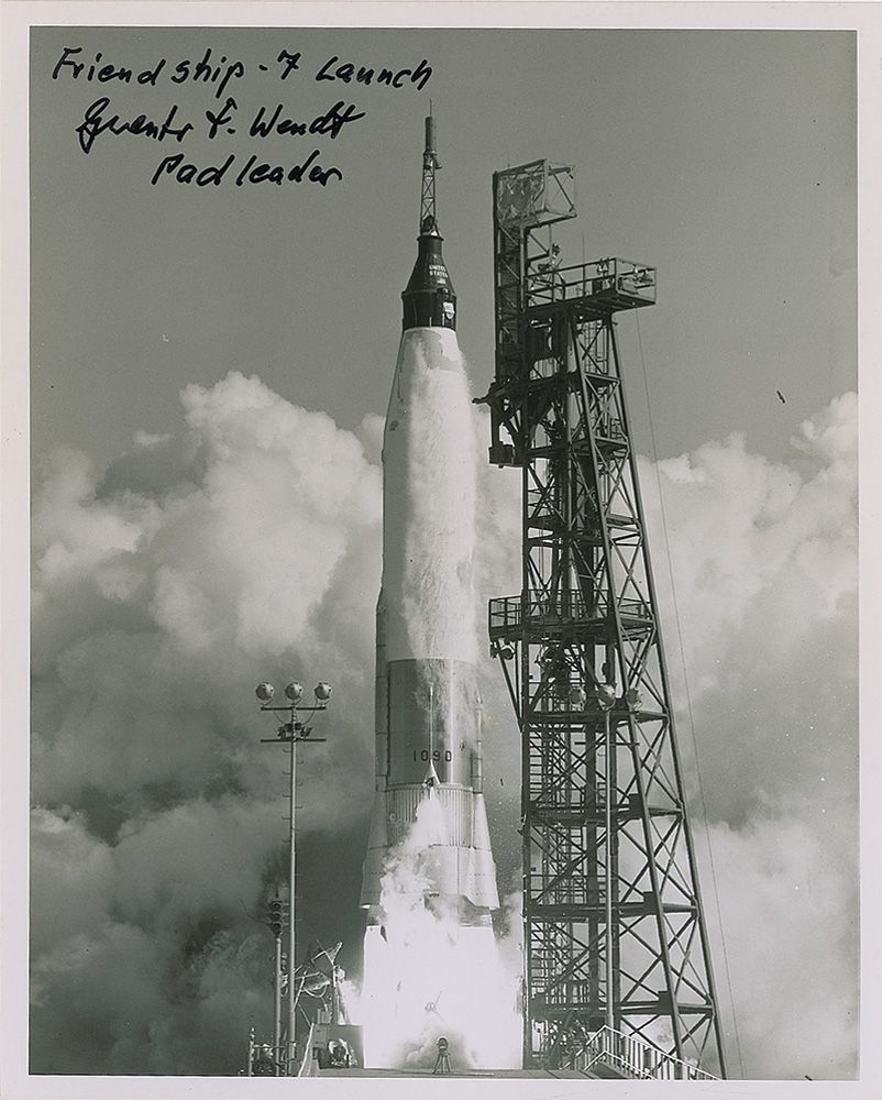 Glossy 8 x 10 NASA photo of the Friendship 7 liftoff, signed in black felt tip, “Friendship 7 launch, Guenter F. Wendt, Padleader.” In fine condition.