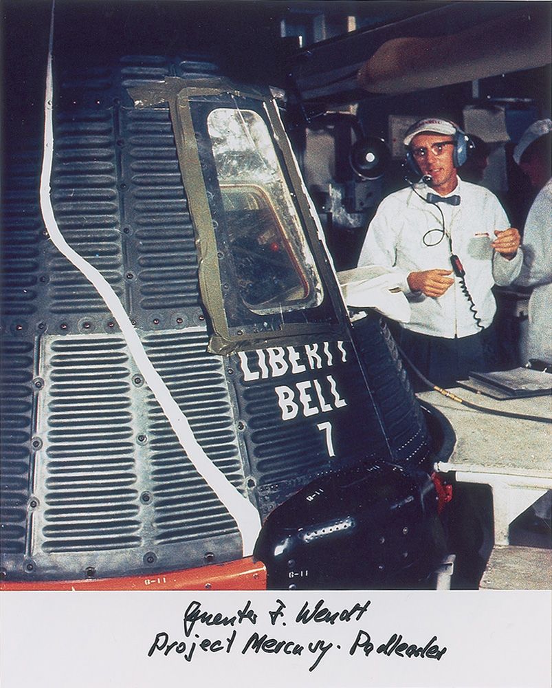 Two satin-finish photos: one color 8 x 10 photo of Wendt near the Liberty Bell 7 capsule, signed in the lower border in black felt tip, “Guenter F. Wendt, Project Mercury Padleader”; and one 10 x 8 group photo, signed in black felt tip, “Mercury preparation crew on Pad 5, Guenter F. Wendt, Padleader.” In fine condition.