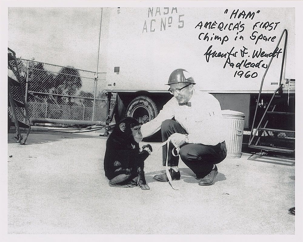 Satin-finish 10 x 8 photo of Wendt with Ham the chimpanzee, signed in black felt tip, “‘Ham,’ America’s first chimp in space, Guenter F. Wendt, Padleader, 1960.” In very fine condition.