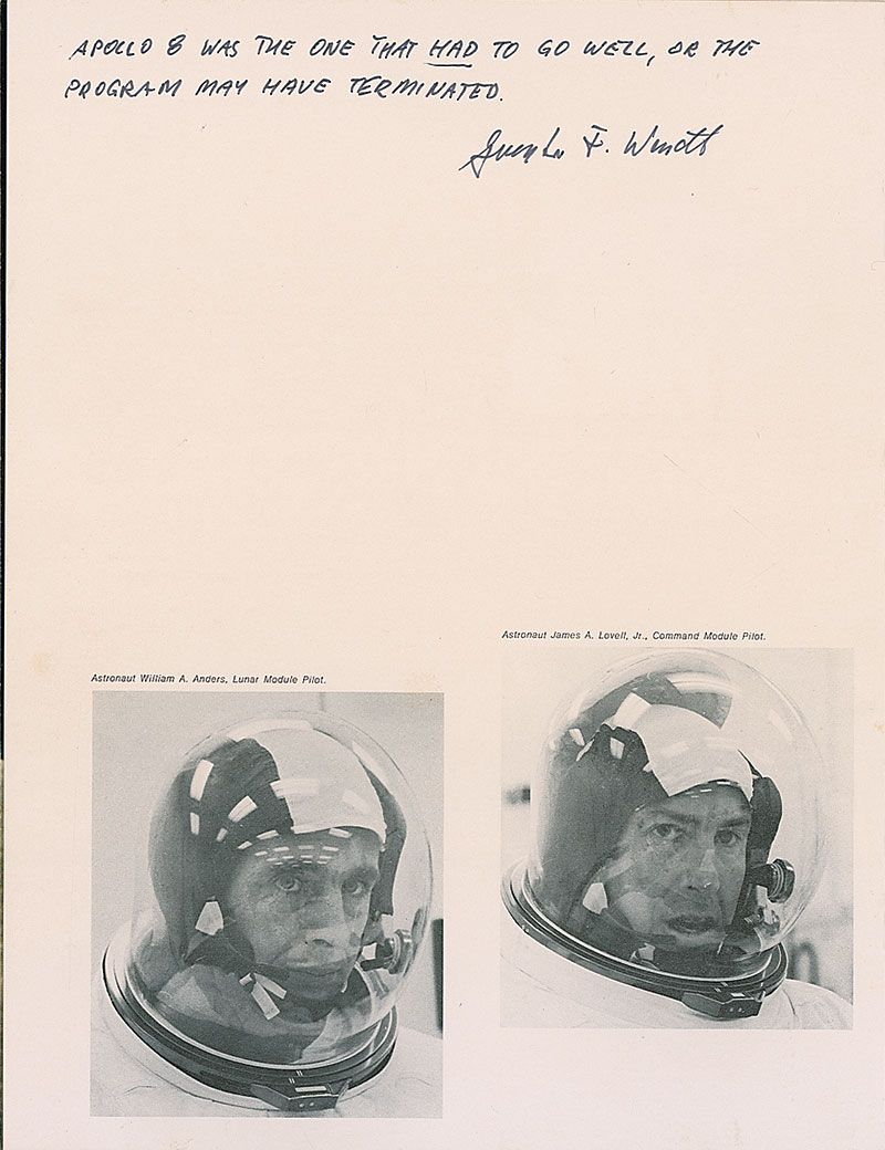 Two items: one original Apollo 8 booklet, 8 x 10.25, 24 pages, signed inside the front cover in black felt tip, “Apollo 8 was the one that had to go well, or the program may have terminated, Guenter F. Wendt”; and one color glossy 5 x 3.5 photo of Wendt with a shuttle model, signed in black felt tip, “Still smiling, Guenter F. Wendt.” In overall fine condition.
