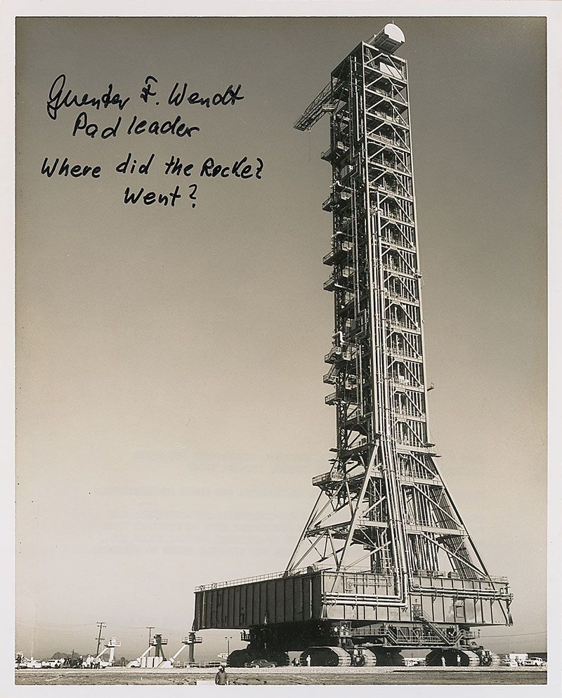 Glossy 8 x 10 NASA photo of an empty launch pad, signed in black felt tip, “Guenter F. Wendt, Padleader, Where did the rocket went?” In fine condition, with a few scattered surface dings.