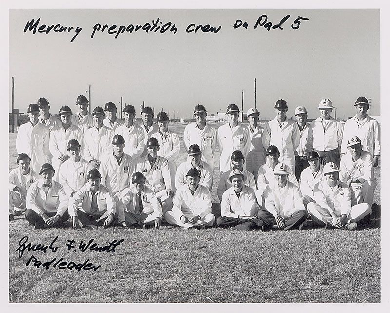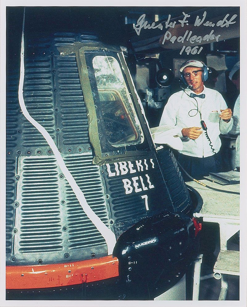 Two satin-finish photos: a color 8 x 10 of Wendt next to the Liberty Bell 7, signed in silver ink; and a 10 x 8 of the Mercury crew, signed in black felt tip, “Mercury preparation crew on Pad 5, Guenter F. Wendt Padleader.” In very fine condition.