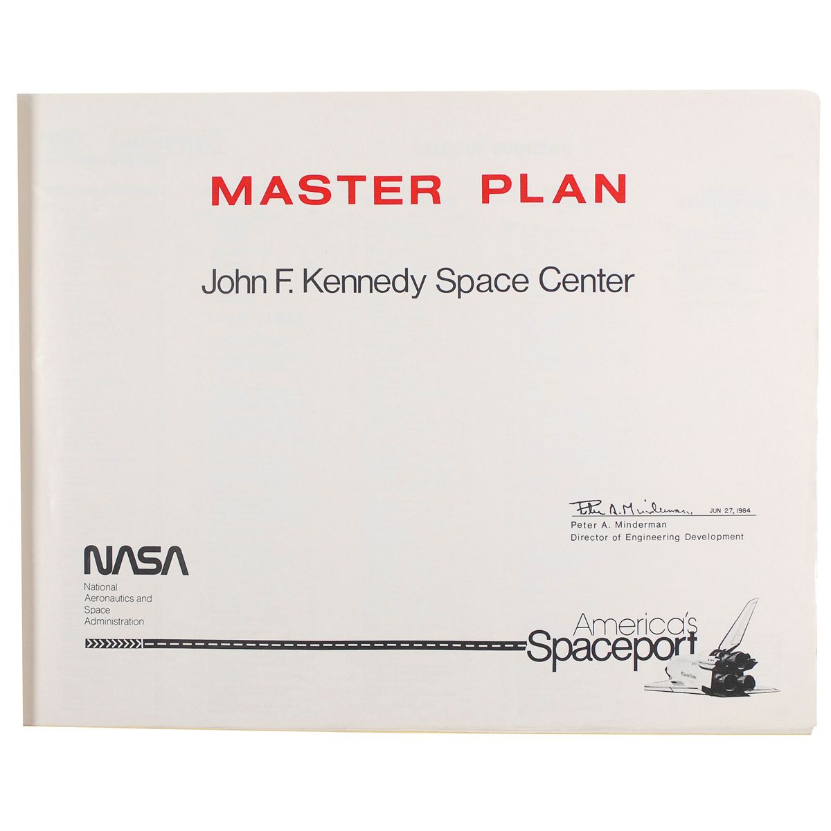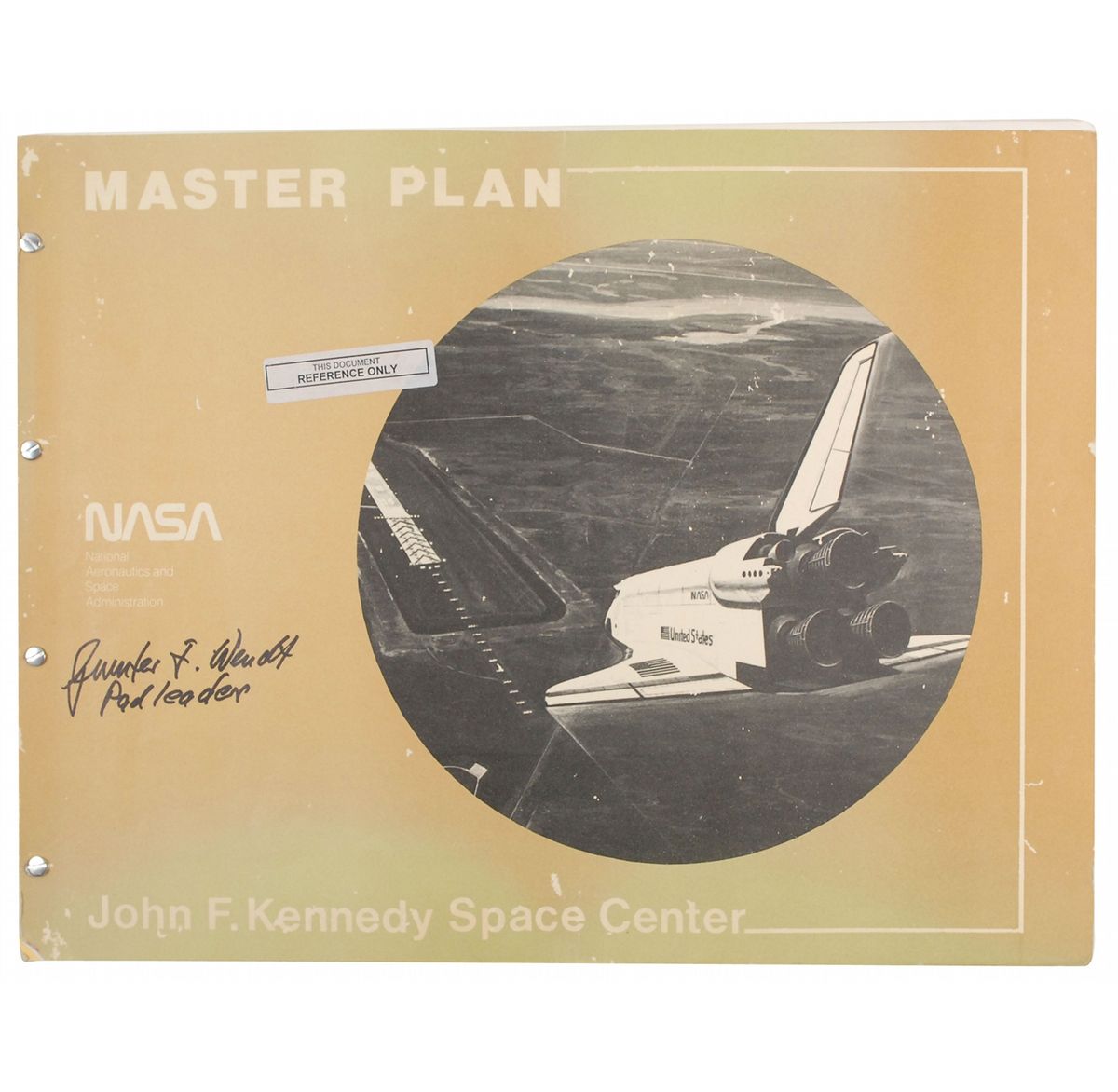 Large brad-bound John F. Kennedy Space Center Master Plan, 22 x 17, dated April, 1994, and signed on the front cover in black felt tip, “Guenter F. Wendt, padleader.” Publication is full of maps, drawings, and schematics for the center’s future expansion and projects. In fine condition, with expected handling wear and some scattered toning and light surface loss to front cover.