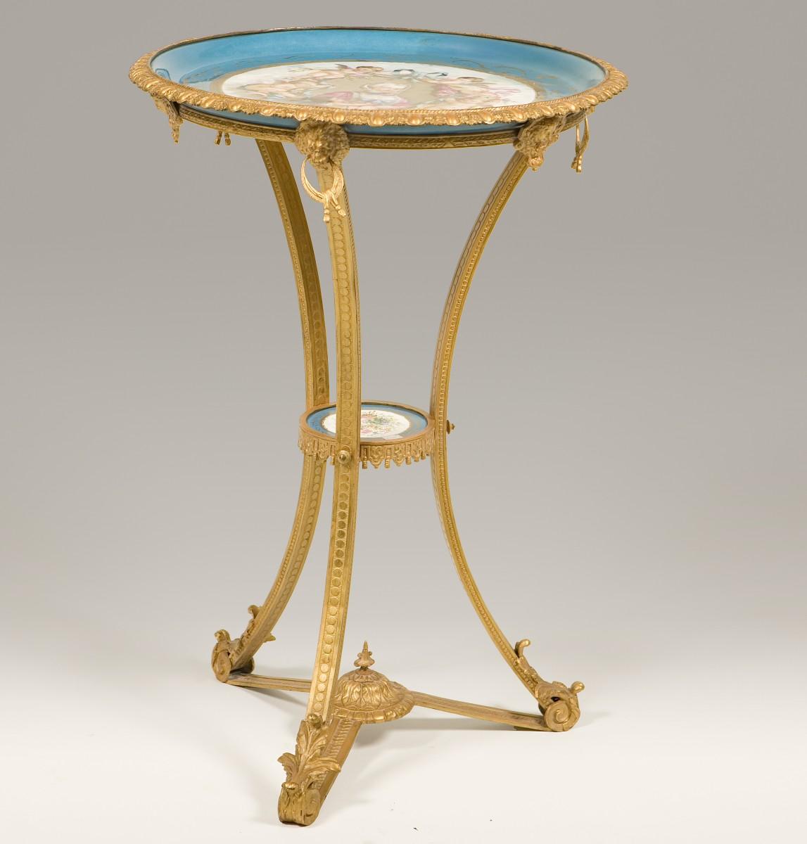 cm 81 gilt bronze, the dished top and undertier decorated in the manner of Sèvres with figures of putti and a lady dressed in the style of XVIII century, France, second half of the XIX century. For a similar lot see: Sotheby's New York, 29 march 2007, lot 485