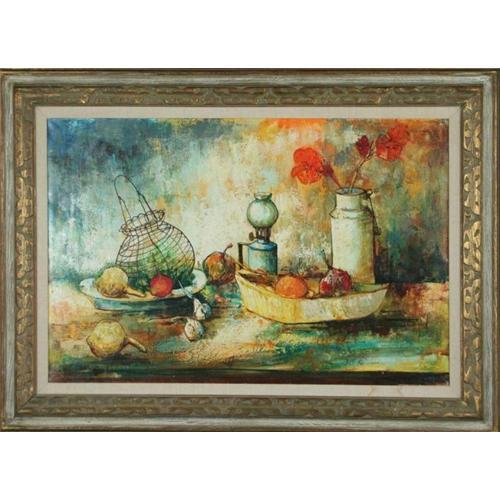 This is a beautiful oil on canvas painting that demonstrates the artist?s competence and control of the medium. The bold use of line combined with the vibrant colors and impasto style of painting display the artist?s confidence in his work. It is a unique style that is very well rendered, and exhibits the skill level of its artist. This painting measures, 32? x 44?, including its very appealing frame that is perfectly suited to the painting complimenting not only the colors in the painting but also the texture of the frame promotes the textures of the paint as well. In excellent shape and very good quality.