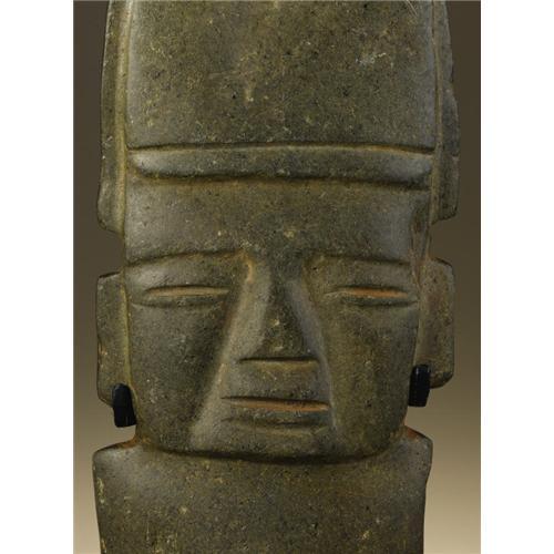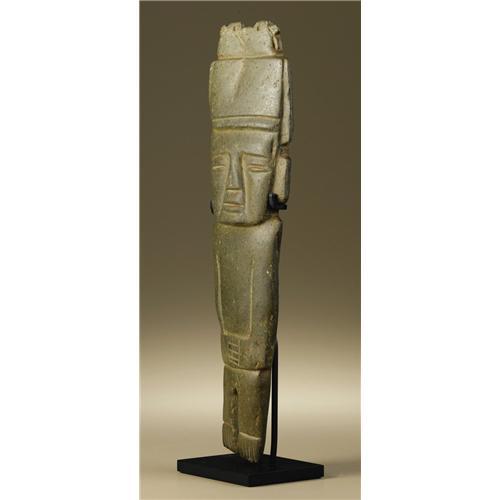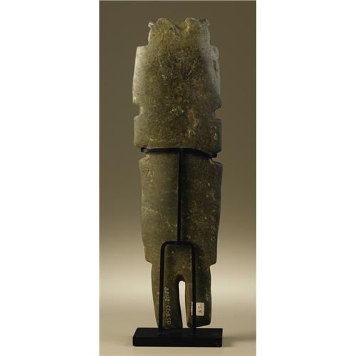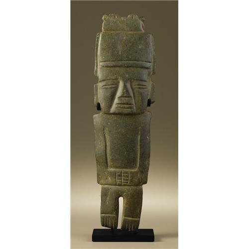 <B>Standing Dignitary with Bird-form Headdress</B></I><BR>Guerrero<BR>200 B.C. - A.D. 600<BR>Green stone (serpentine?) with traces of red pigment, Weight 1.57 kg.<BR>Height 14 1/2 in. Width 4 3/16 in.<BR><BR>The tall, frontally-viewed figure is shown with a trapezoidal face with flanges. Features are schematic. The combined size of the headdress with its opposing bird heads balances the facial area. The rectangular upper body terminates in clasped hands with the fingers delineated. His short, separated legs end in feet with visible toes.<BR>As with so many of the stone figures from Guerrero this large example defies stylistic or cultural designation. The extraordinary range of parallel figures and masks found in the many cached deposits at the Aztec Templo Mayor may only serve to add complication, since they also have neither provenance nor chronological associations from their times and places of origin. The figure is in excellent condition, with some fine surface scratches.<BR><BR>Provenance<BR>John-Platt Collection (Daniel M. Friedenberg)<BR>Splendors of the World, Haiku, Hawaii<BR><BR>Publication<BR>Von Winning, Hasso, <I>The John-Platt Pre-Columbian Collection.</B></I> Charlottesville: The University of Virginia Art Museum, 1986, p. 48, fig. 56.<BR><BR>