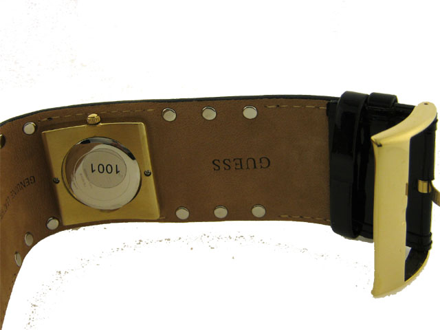 This is a Guess Cuff Leather Ladies WATCH W15043L1 with the following features: Round Gold Face; Black Leather Cuff Band with "G" logos; Gold tone hardware and lace up effect; 38mm band width; Stainless Steel Caseback; and Japan Movement