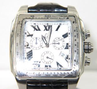 Guess Stainless Steel, Chronograph, Tachymeter, Leather Strap Men's Watch.The total watch's weight is 137.4 grams.The measurements of the watch head is 45 x 40 mm and 13 mm in thick.The length of watch: 10".Leather Strap is 23 mm wide.Water Resistant.Swiss Made