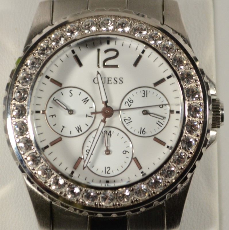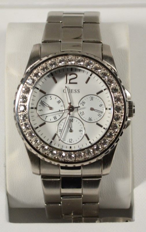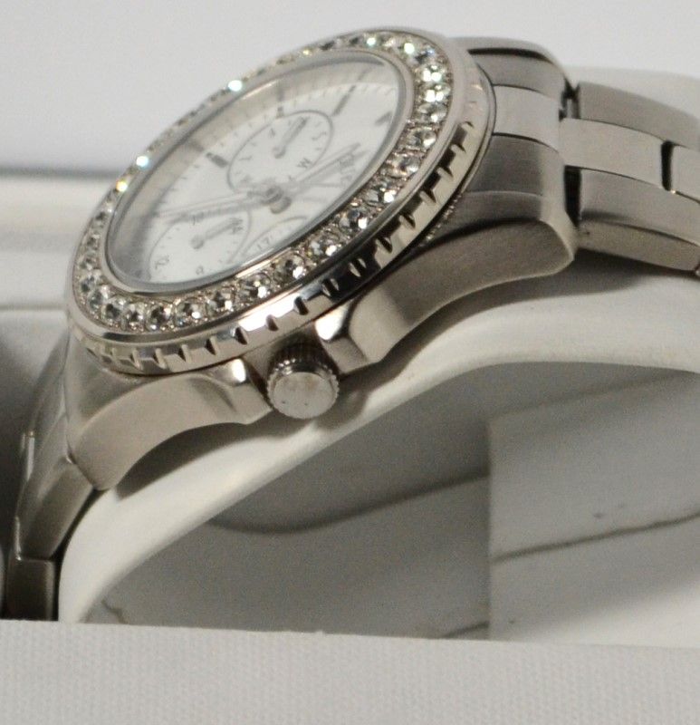 Appears to be new & unworn. Multi functional dial with Day, Date and 24-hr indicator. Enamel white case with Steel Dial. 37mm x 37mm x 13mm. Water Resistant 50 M/165 FT. Battery Included, Stainless Steel. EST 175.00-200.00