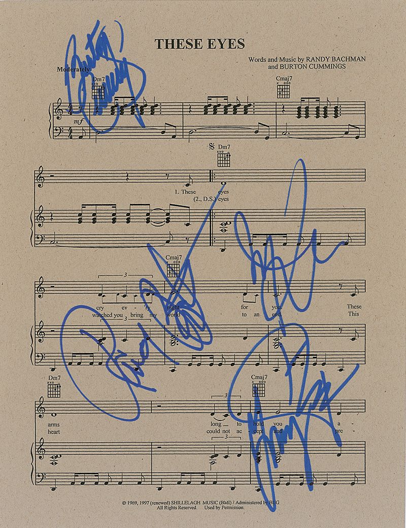 Printed sheet music to ‘These Eyes,’ on four light brown 8.5 x 11 cardstock pages. Signed on the first page in blue felt tip by Burton Cummings, Randy Bachman, Jim Kale, and Garry Peterson. In very fine condition.