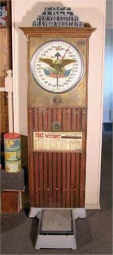 "Guesser" Public Scale Company, Chicago, IL "1915" originally 1 cent, wood cabinet/porcelain base/art deco marquis/brass plate/restored 1975. works.