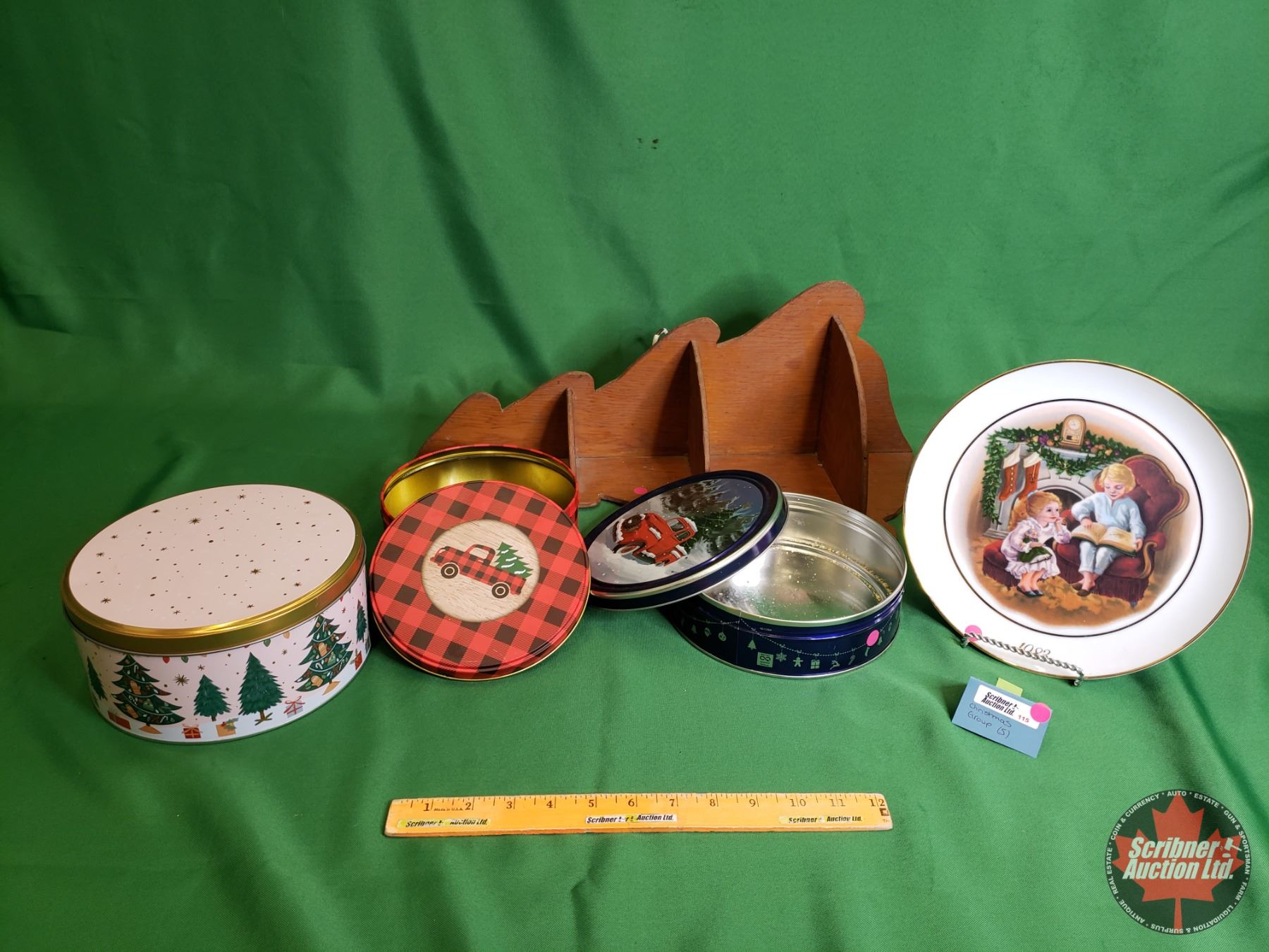 Guest Consignor : Christmas Combo (Tins, 1983 Collector Plate & Wood Tree Shelf) (Shelf Measures 23"H) (SEE PICS!)