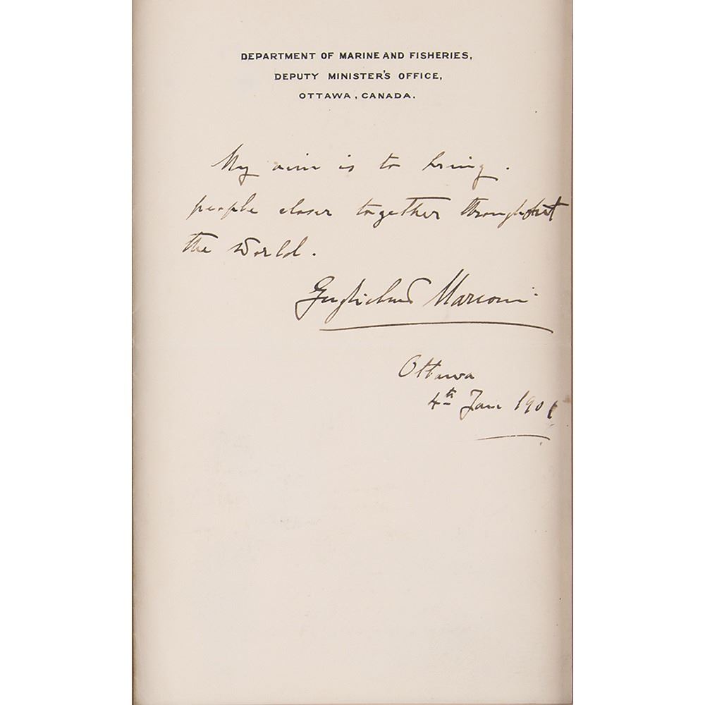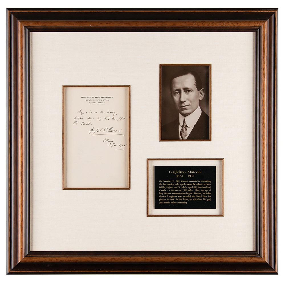 Highly desirable AQS on an off-white 5 x 8 sheet of Department of Marine and Fisheries, Deputy Minister’s Office (Ottawa, Canada) stationery, signed at the conclusion in fountain pen, “Guglielmo Marconi, Ottawa, 4th Jan. 1901.” The quote, in full: “My aim is to bring people closer together throughout the world.” Handsomely cloth-matted and framed with a portrait and an engraved plate to an overall size of 22.5 x 22. In fine condition.