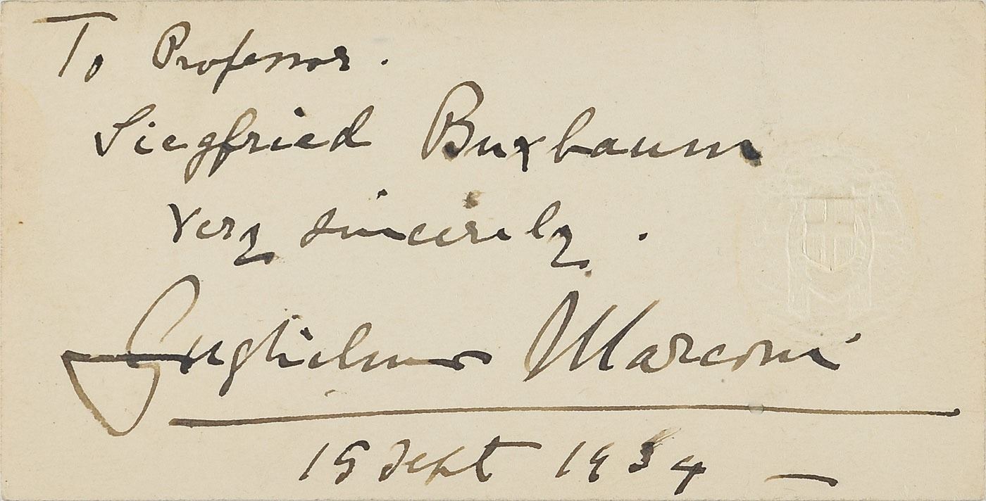 Italian physicist and inventor (1874–1937) who devoted his life to experiments in wireless communication, and was awarded the Nobel Prize in 1909. Ink signature and inscription, "To Professor Siegfried Burghauer, very sincerely, Guglielmo Marconi, 15 Sept. 1934,” on an off-white 4 x 2 card. In fine condition.