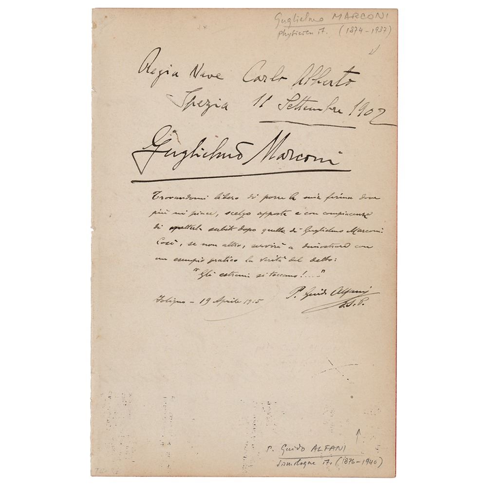 Desirable fountain pen signature, "Regia Nave Carlo Alberto, Spezia 11 Settembre 1902, Guglielmo Marconi,” on an off-white 4.5 x 7.25 album page, which is signed below by Italian astronomer and seismologist Guido Alfani (1876-1940), and on the reverse by German writer Gabriele Reuter (1859–1941). In fine condition. The Carlo Alberto was the Italian Navy battleship from where, in 1902, Marconi conducted wireless experiments, successfully transmitting radio communications across the mountain chains of Europe.