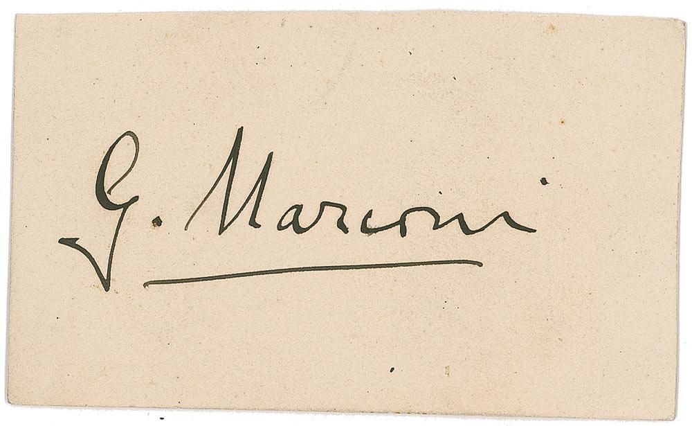 Nobel Prize–winning, Italian-born engineer (1874–1937) who developed ‘wireless telegraphy,’ better known to the world at large as radio. Ink signature, “G. Marconi,” on an off-white 3 x 1.75 card. In fine condition, with trimmed top edge and some scattered light soiling.