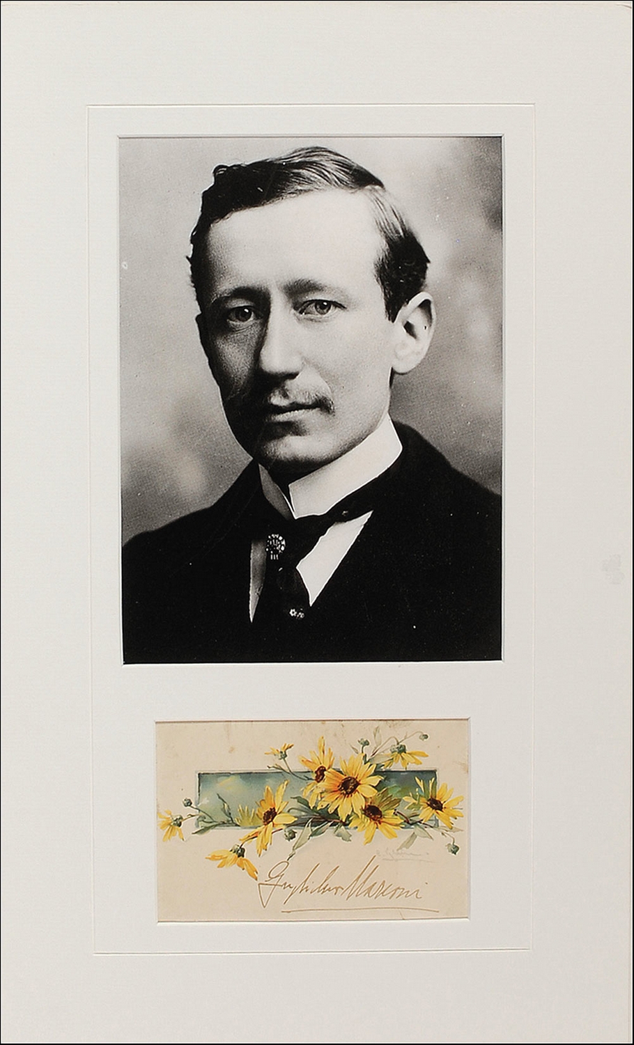 Vintage fountain pen signature, “Guglielmo Marconi,” on an off-white 5.25 x 3.5 floral-printed card. Matted with a glossy portrait to an overall size of 11 x 18. In fine condition, with areas of staining and soiling touching his signature in a few spots.