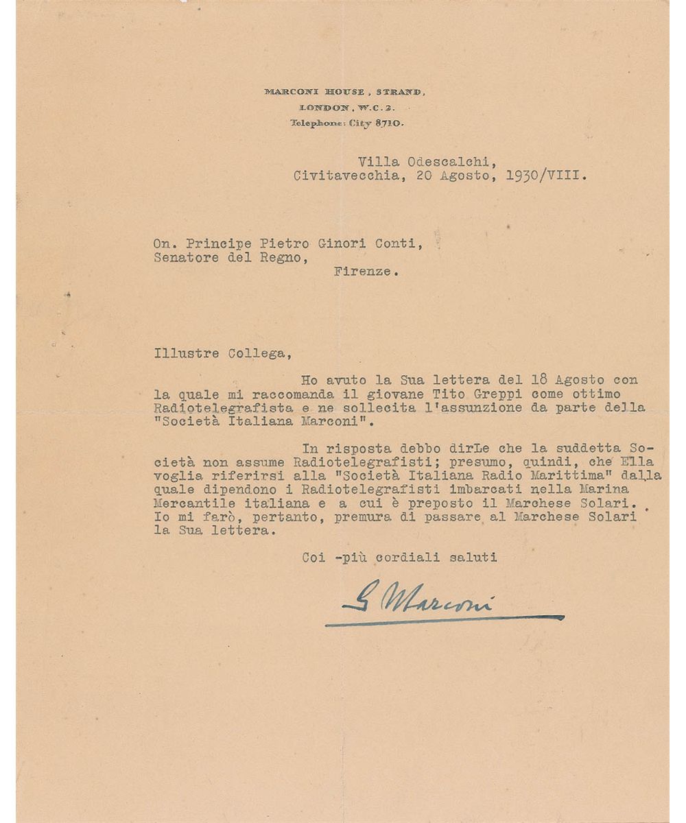 TLS in Italian, signed “G. Marconi,” one page, 8 x 10, personal letterhead, Villa Odescalchi Civitavecchia, August 20, 1930. Letter written to The Honorable Peter Prince Ginori Conti, Senator of the Kingdom, Florence. Translated in full: “I have received your letter of August 18 where you recommend the young Tito Greppi as an excellent radio operator who could work for the Firm ‘Marconi Italia.’ I must answer you that the above Company employs no radiotelegraphists. I assume, therefore that you probably meant the firm ‘Italia Marittima’ on which depend the radio operators who embarked in the Italian Merchant Navy, which is headed by the Marchese Solari. I will, therefore, send your letter to the Marchese Solari. Most cordial greetings.”Intersecting folds, light scattered creases, and staple holes to the left border, otherwise fine condition.