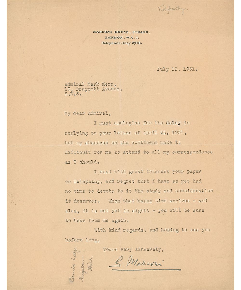 TLS signed “G. Marconi,” one page, 8 x 10, personal letterhead, July 13, 1931. Letter to Admiral Mark Kerr. In part: “I read with great interest your paper on Telepathy, and regret that I have as yet no time to devote to it the study and consideration it deserves. When that happy time arrives—and alas, it is not yet in sight!—you will be sure to hear from me again.” Central vertical and horizontal folds (vertical fold passing through first letter of signature), light toning, and a few pencil notations, otherwise fine condition.