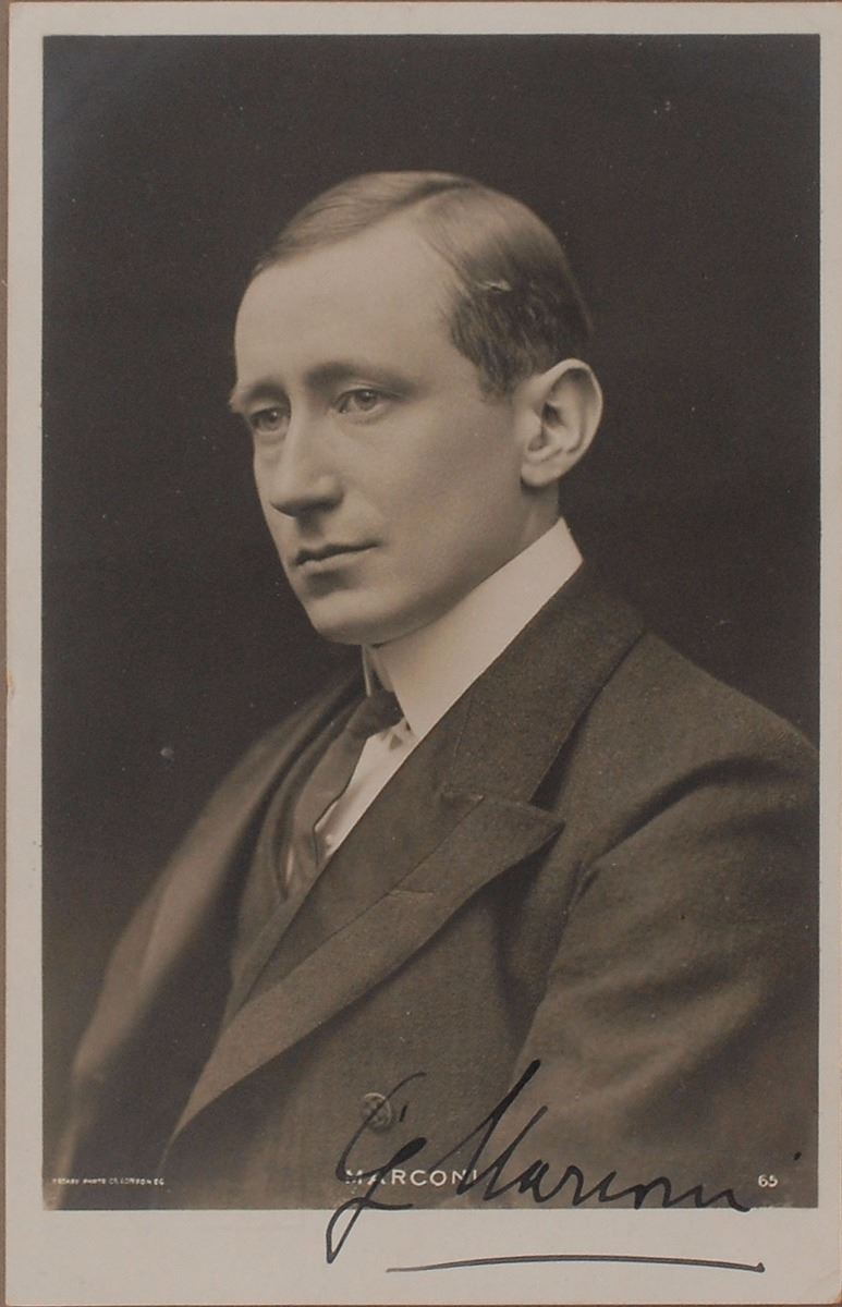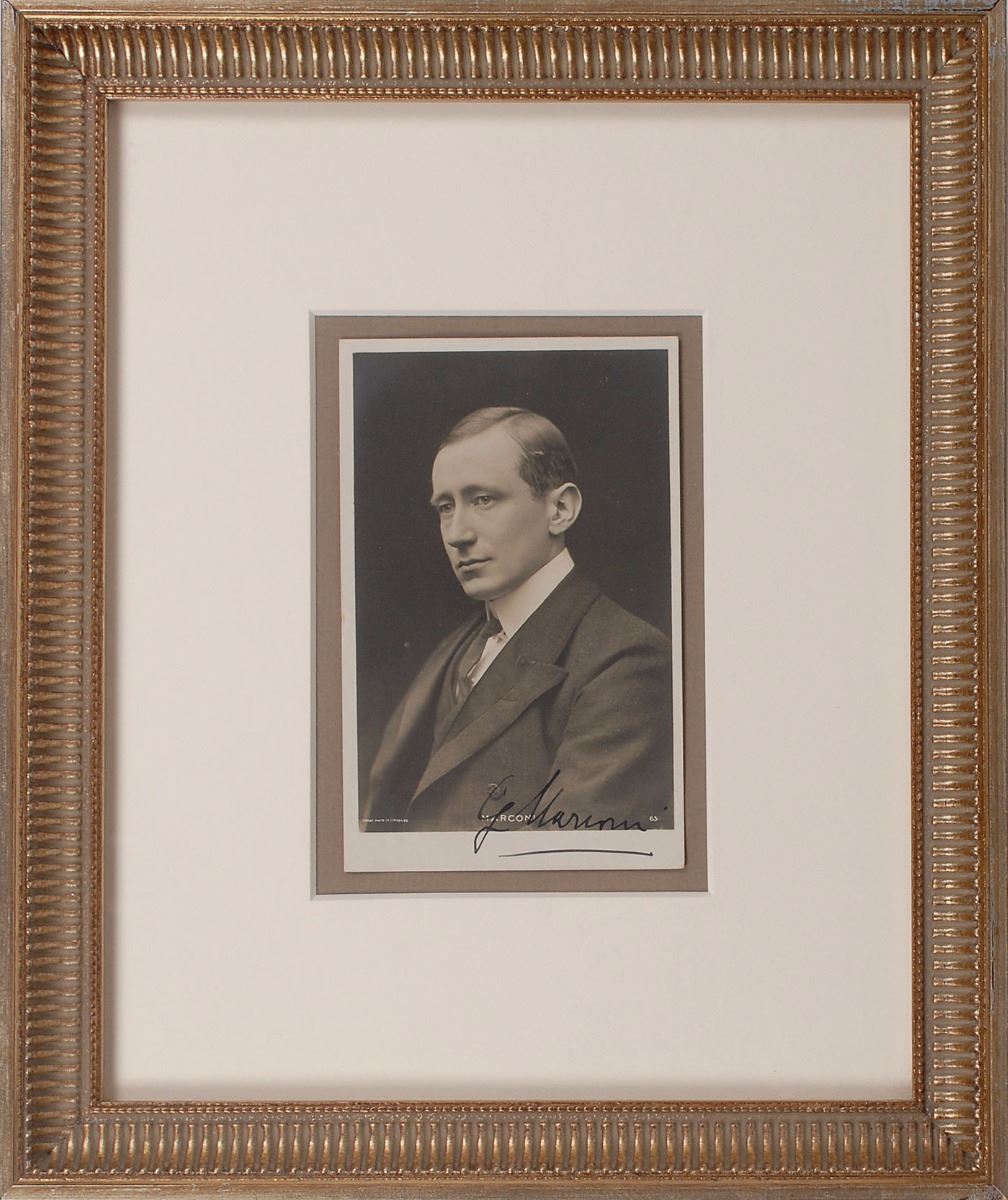 Handsome vintage 3.5 x 5.5 postcard portrait of the famed Italian physicist, signed along the bottom in ink, “G. Marconi.” Mounted, matted, and framed to an overall size of 10 x 12. In fine condition, with a trivial crease and ding to left edge.