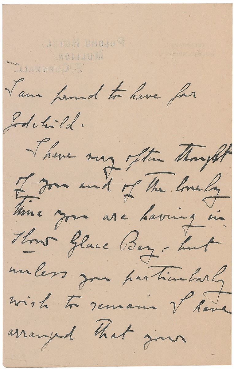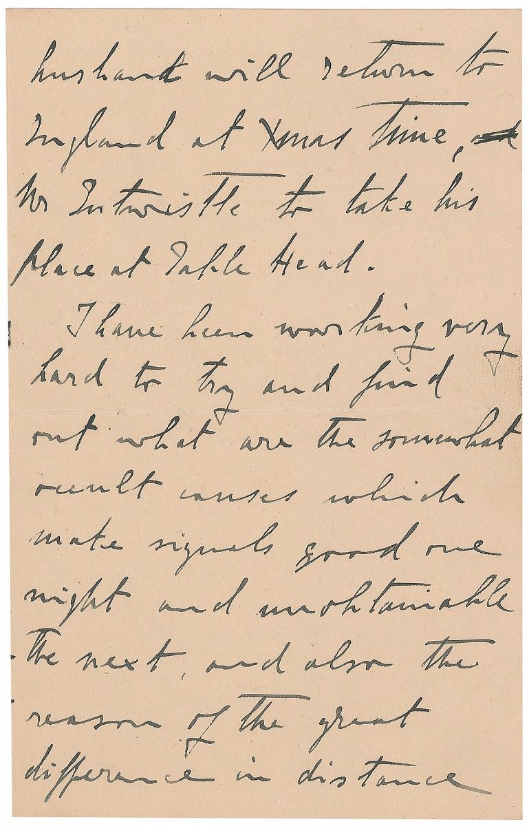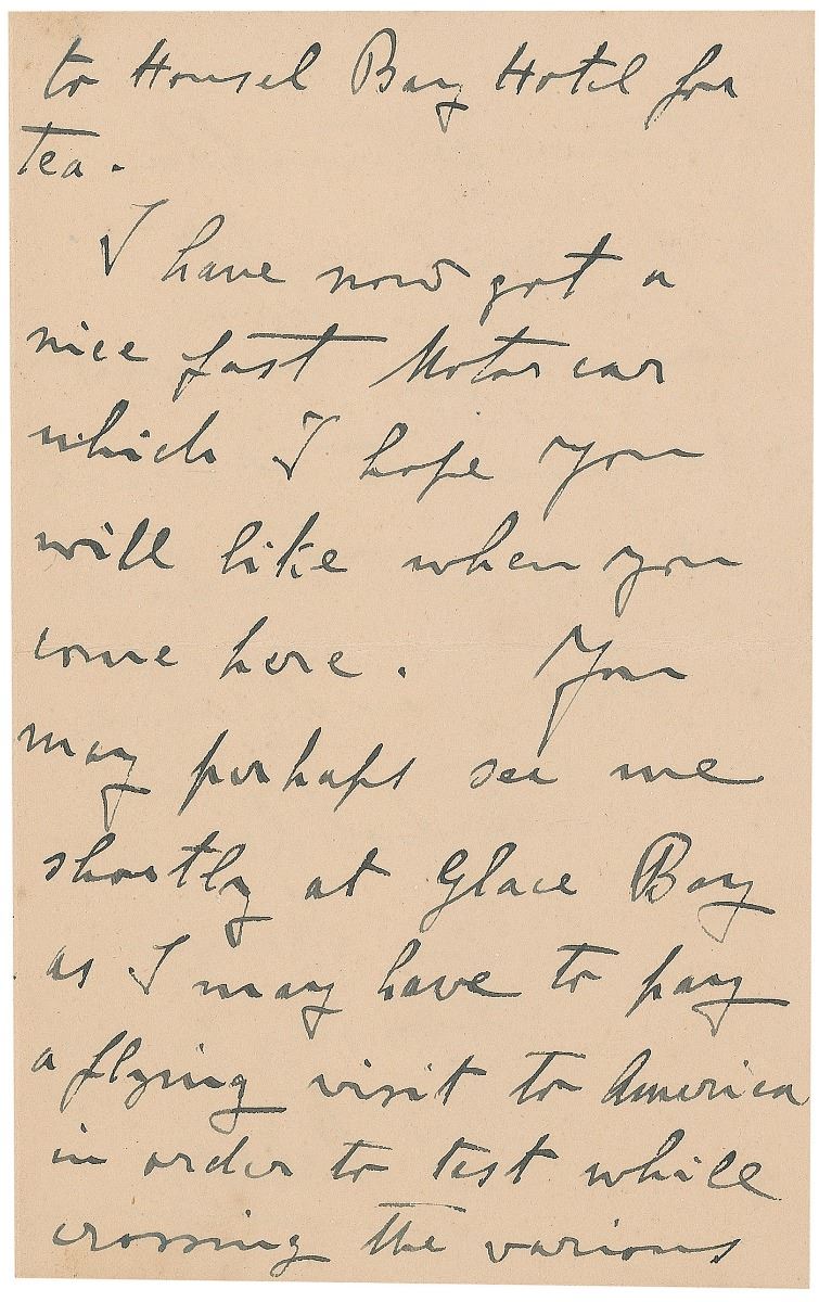 The typed letters date from 1907 to 1909 and are written in Marconi's capacity as managing director to Vyvyan at Glace Bay, concerning day-to-day telegraph operations and equipment, employees, and scheduling. In a letter of August 29, 1907, he writes: "Since my return here from London a few days ago I have been carrying out some interesting work. We are at present using only about half the available power of the plant, and the results of the programme, according to latest reports, are satisfactory in the light of the arrangements which we are using at this end. I hope that, by the time this letter reaches Glace Bay, you will have received the discs which were sent in charge of the operator of the 'Empress of Ireland' last Friday." On May 14, 1908, he writes: "I have your report…and am sorry to note that you are still suffering very much from X-s at your station. It is difficult to understand why these X-s have been so persistent for the last few weeks, and I hope you are doing all in your power to ascertain whether the Receiving apparatus and Receiving Aerial are so adjusted as to allow of the most efficient reception." He continues to address the issue a month later, writing on June 10th, "As I informed you in my previous letter, I hope as soon as I can get back to my experiments to make further improvements in connection with the X-stopping device." In his ongoing attempts to improve the station's equipment later in the year, Marconi writes: "I have to consider ways and means for the proper management of the station during your absence…Before you leave Glace Bay I wish you to order a Generator suitable for producing such a current to drive a 50 H.P. Motor which will be directly coupled to the new disc." These letters are more formal in tone and often briefly touch upon technical subjects.