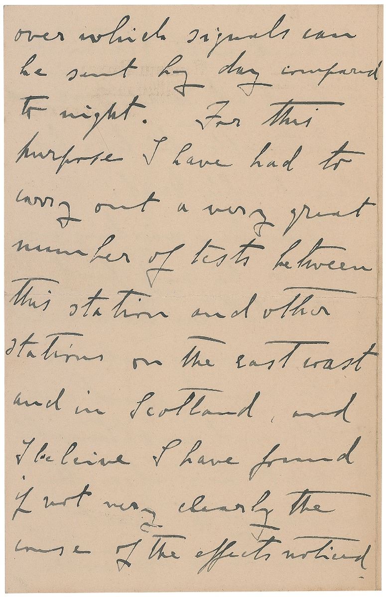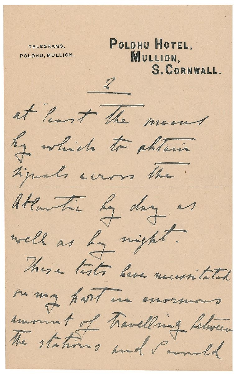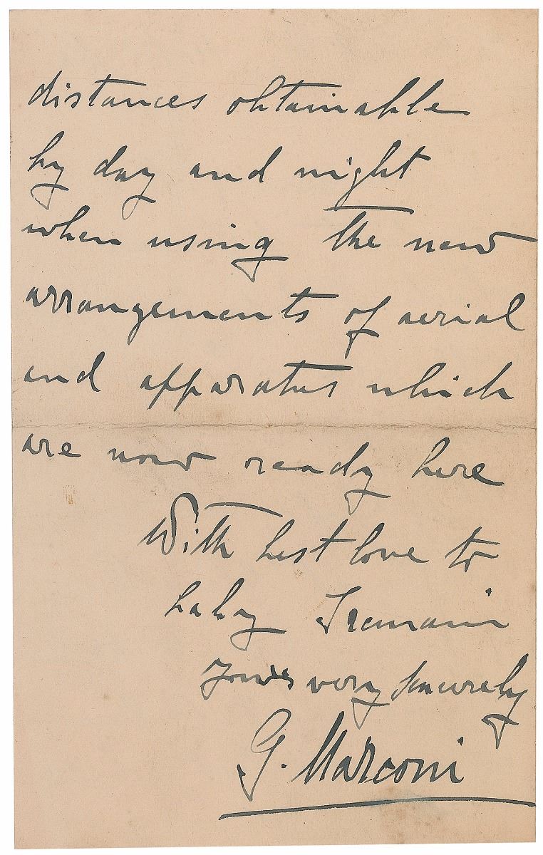 Large archive of 31 letters by Marconi, including eight ALSs totaling 41 pages and 23 TLSs totaling 36 pages, dated between 1902 and 1909. Nearly all are to engineer Richard N. Vyvyan, with a handful of others written to his wife. The handwritten letters date from 1902 to 1905, the time of the first transmission of a telegraph signal from Canada to England. On August 5, 1903, Marconi writes: "I have been working very hard to try and find out what are the somewhat occult causes which make signals good one night and unobtainable the next, and also the reason of the great difference in distance over which signals can be sent by day compared to night. For this purpose I have had to carry out a very great number of tests between this station [Poldhu] and other stations on the east coast and in Scotland, and I believe I have found if not very clearly the cause of the effects noticed at least the means by which to obtain signals across the Atlantic by day as well as by night." In a lengthy eight-page letter of May 15, 1904, marked "Private," he reports on "results obtained from the working of the Poldhu station during the last voyage of the S.S. Campania, from Liverpool to New York…I have undertaken to carry out a series of tests to war ships stationed at different points, the receiving apparatus being taken in charge of by our assistants. I shall try various sending arrangements at Poldhu." Marconi also discusses general domestic life, such as his wife, family, and home in Cape Breton.