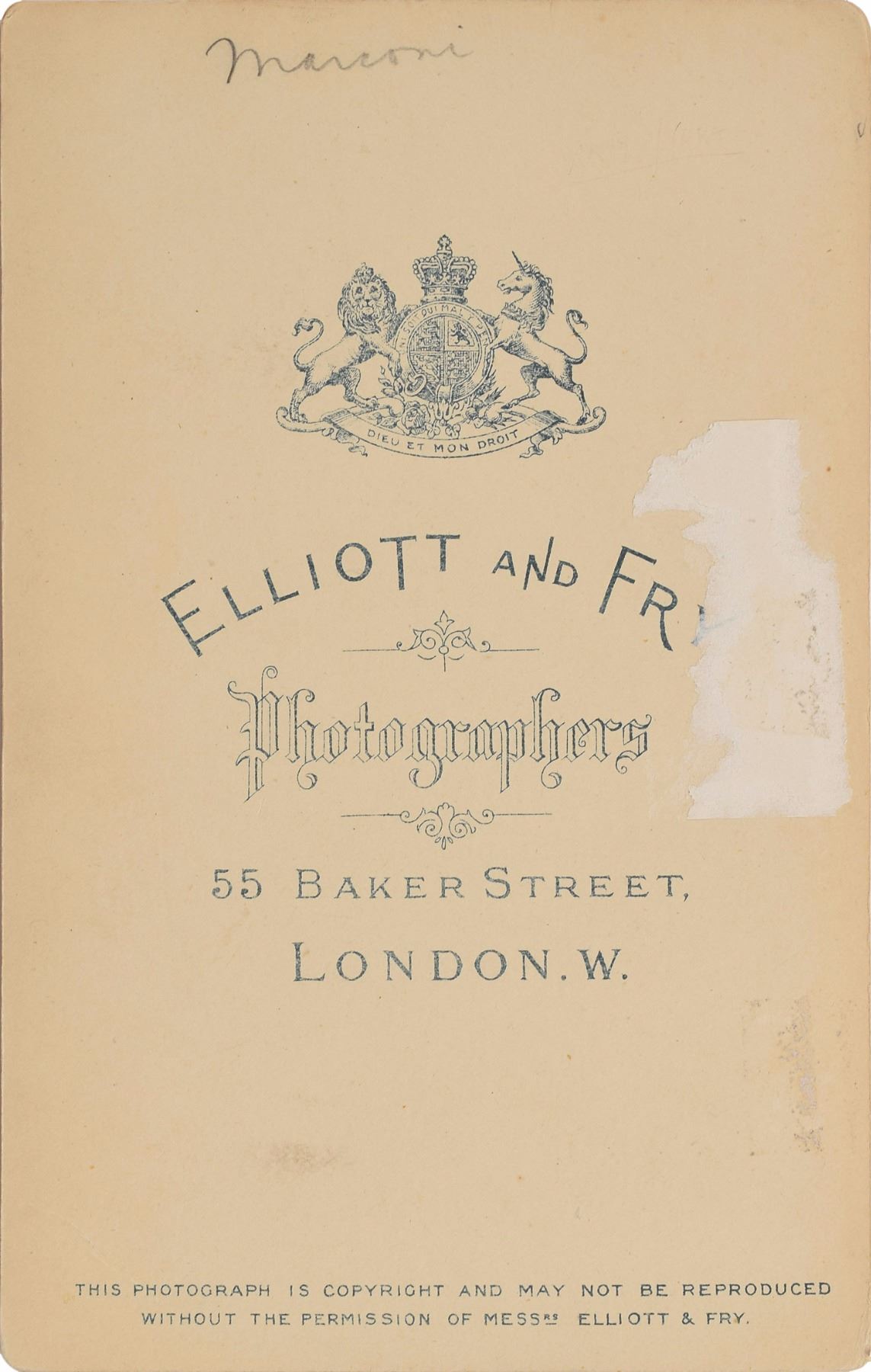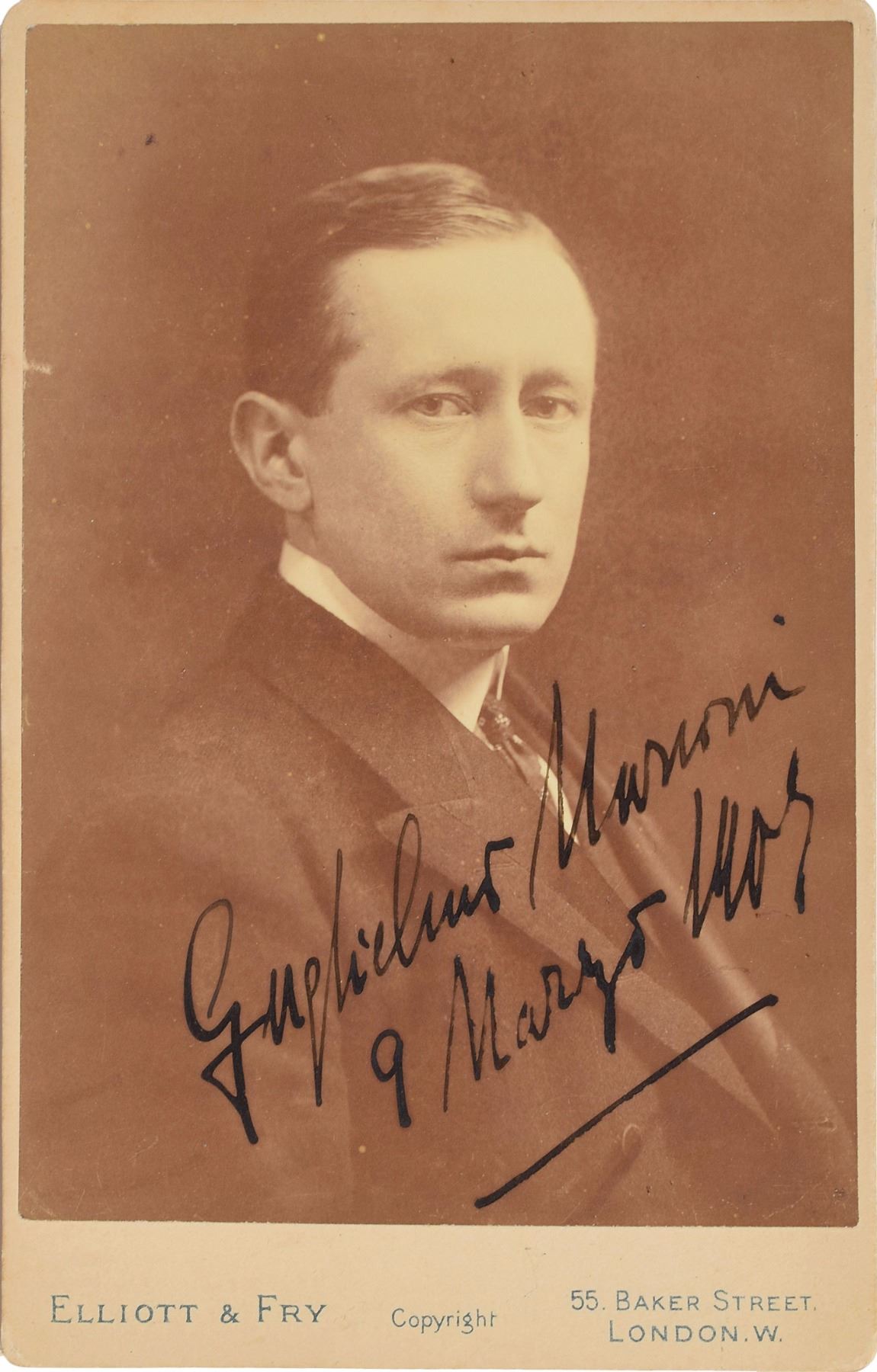 Superb 4.25 x 6.5 cabinet photo of Marconi by Elliott & Fry of London, prominently signed in bold black ink, "Guglielmo Marconi, 9 Marzo 1907." In fine condition, with a small mounting remnant to reverse. Marconi's first transatlantic wireless telegraphy stations, built in Clifden, Ireland and Glace Bay, Nova Scotia, opened for public service only months later in October 1907.