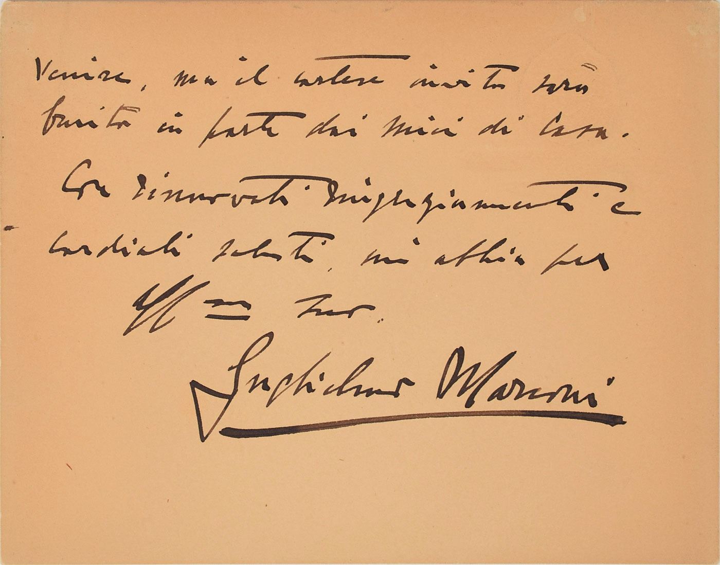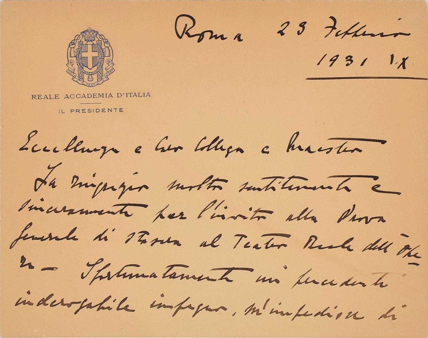 ALS in Italian, one page both sides, 5.25 x 4.25, Reale Accademia d'Italia letterhead, September 23, 1931. Letter to Italian composer Umberto Giordano, his colleague at the Royal Academy of Italy. He thanks him for his invitation to an important concert at the Teatro Reale dell'Opera, but says that he will not be in Rome on that day. In fine condition. Accompanied by the original mailing envelope addressed in Marconi's hand.