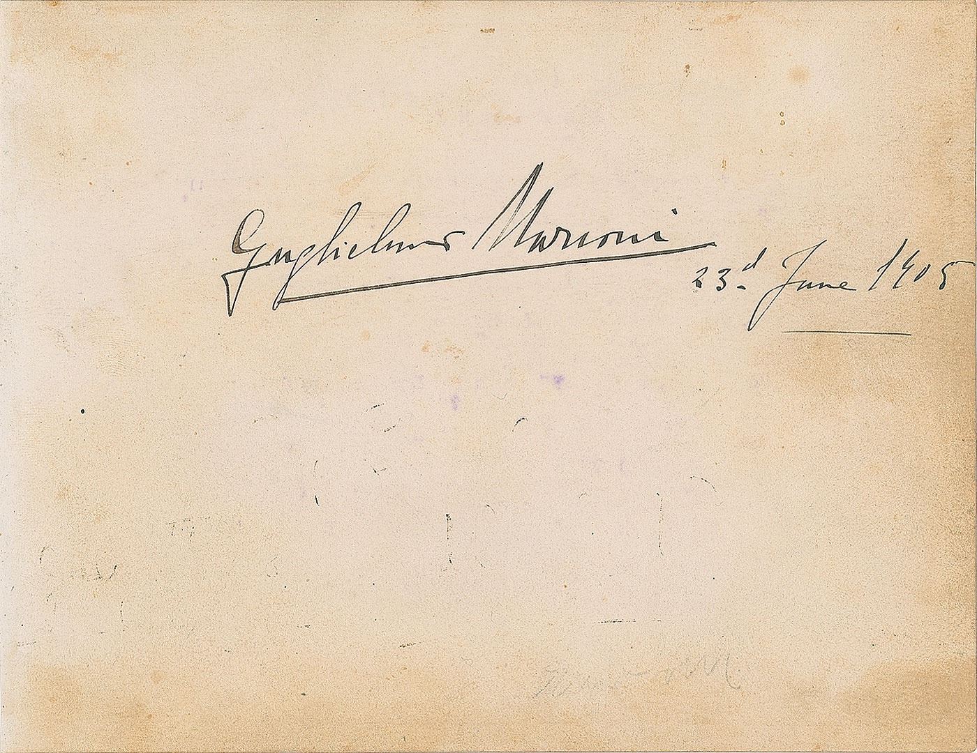 Italian physicist and inventor (1874–1937) who devoted his life to experiments in wireless communication, and was awarded the Nobel Prize in 1909. Bold ink signature, "Guglielmo Marconi, 23d June 1905,” on an off-white 7.5 x 5.75 sheet. In very good to fine condition, with overall soiling and toning.