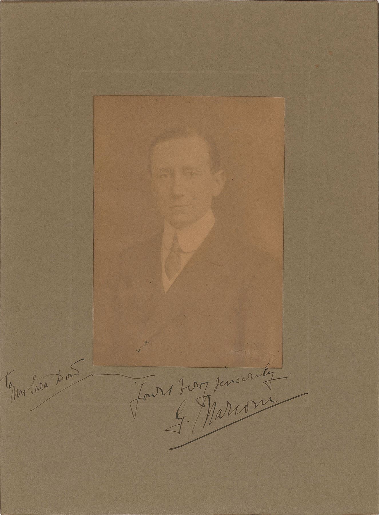 Exceptional sepia matte-finish 4 x 5.75 portrait of Marconi by Pach Brothers of New York, affixed to the original 8 x 10.75 studio mount, signed and inscribed on the mount in fountain pen, "To Mrs. Sara Dow, Yours very sincerely, G. Marconi.” Lower right corner of photo bears a 1906 Pach Bros. copyright stamp. In fine condition, with light rippling, and fading, to the image; the signature remains very bold.