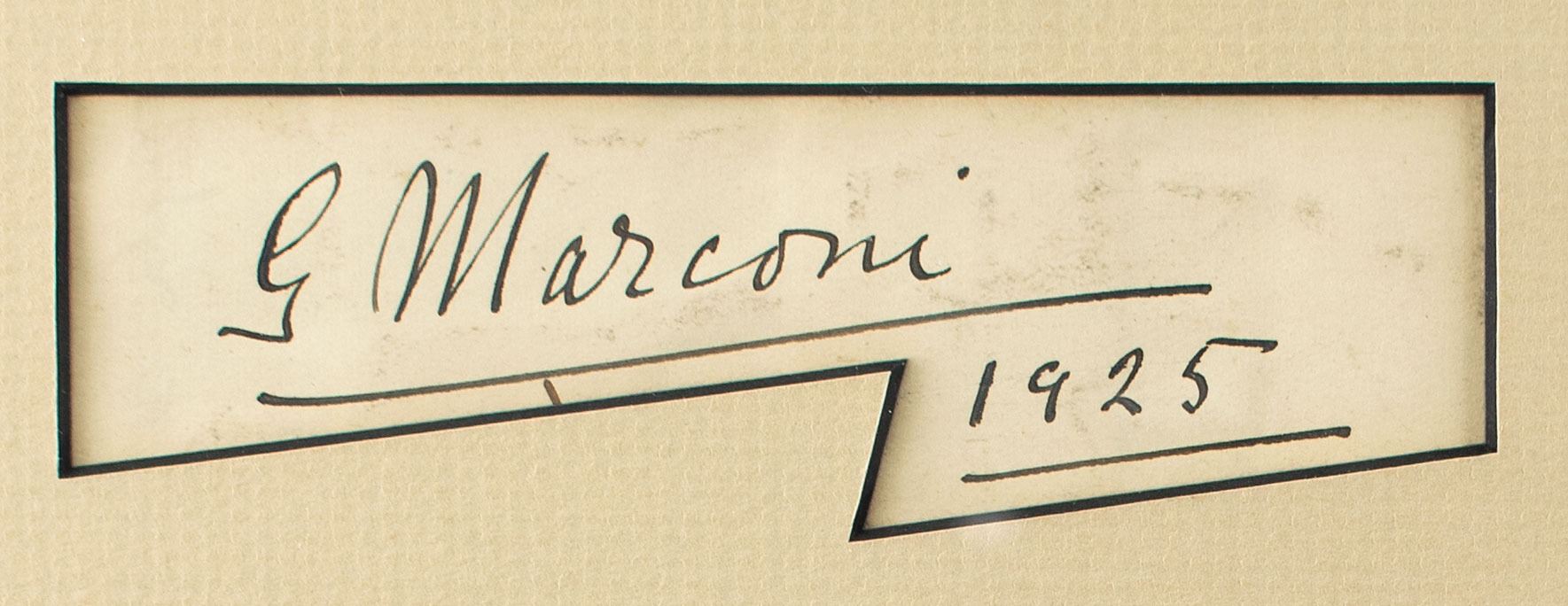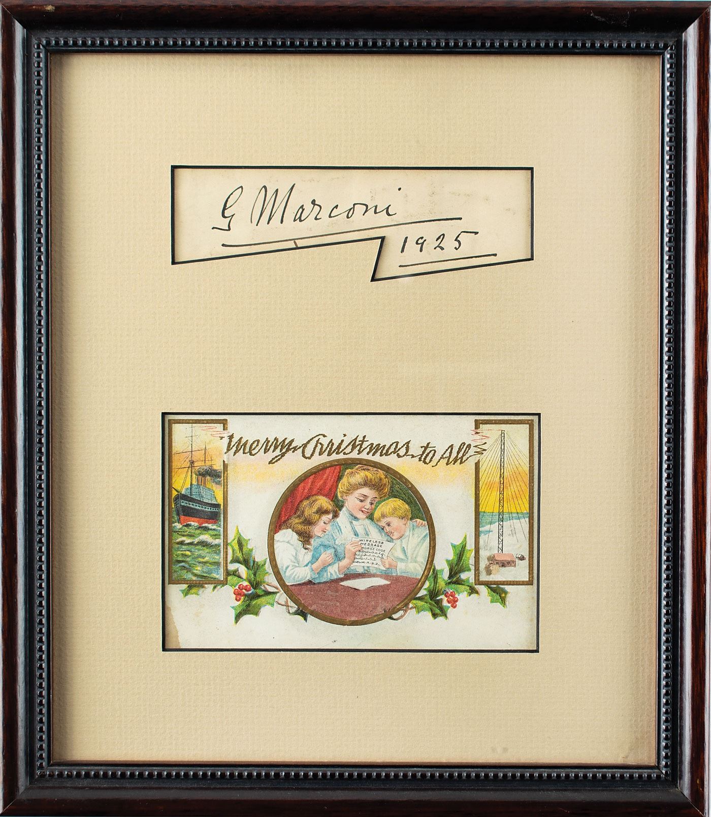 Ink signature, "G. Marconi, 1925,” on an off-white 5 x 1.5 slip. Creatively matted and framed with a Christmas card depicting a wireless message being sent to an overall size of 10 x 11.5. In fine condition, with light soiling to the signature, and a small stain to the lower left corner of the Christmas card.
